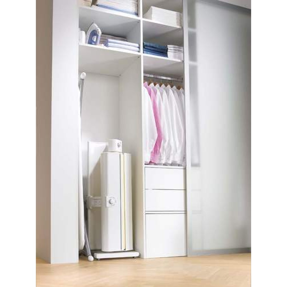 Полупрофессиональная модель с автоматической системой защиты пальцев создает все условия для эффективного глажения больших объемов белья — постельного, столового, детских вещей, спортивной и повседневной одежды. Гладильный вал шириной 83 см со свободным краем рассчитан на работу с изделиями большого размера. Запуск производится при помощи ножной педали, которую можно переместить по выбору пользователя. Это не только освобождает обе руки, но и позволяет сидеть при выполнении работы. Лучшее разглаживание складок и заломов достигается за счет планки, которая под давлением прижимает белье к валу, и специального стола для разглаженных вещей. Установка температуры глажения производится при помощи поворотного регулятора, рационально расположенного с правой стороны. Три нагревательных элемента позволяют равномерно нагревать поверхность вала. Функция пара применяется при разглаживании тонких тканей. В двух резервуарах помещается достаточное количество воды, которой хватает примерно на 40 минут глажения. О необходимости наполнить резервуары сообщит светодиодный сигнал. В сложенном виде устройство занимает не более 0,2 м2 и может поместиться в шкафу.