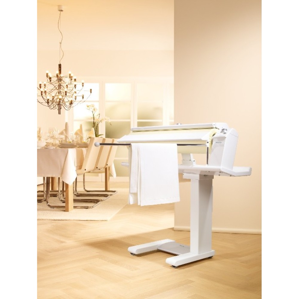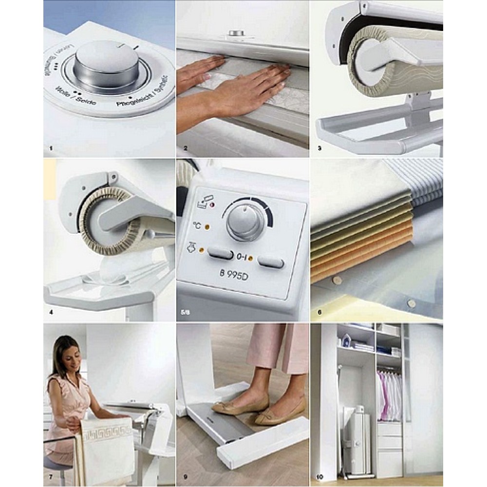 Преимущество гладильной машины Miele B995D в возможности компактного хранения. Машина оснащена наклонной панелью для удобства подачи белья, стол для белья под гладильным валом. Наличие фильтра позволяет использовать обычную водопроводную воду. Гладильный вал вращается с пятью различными скоростями.