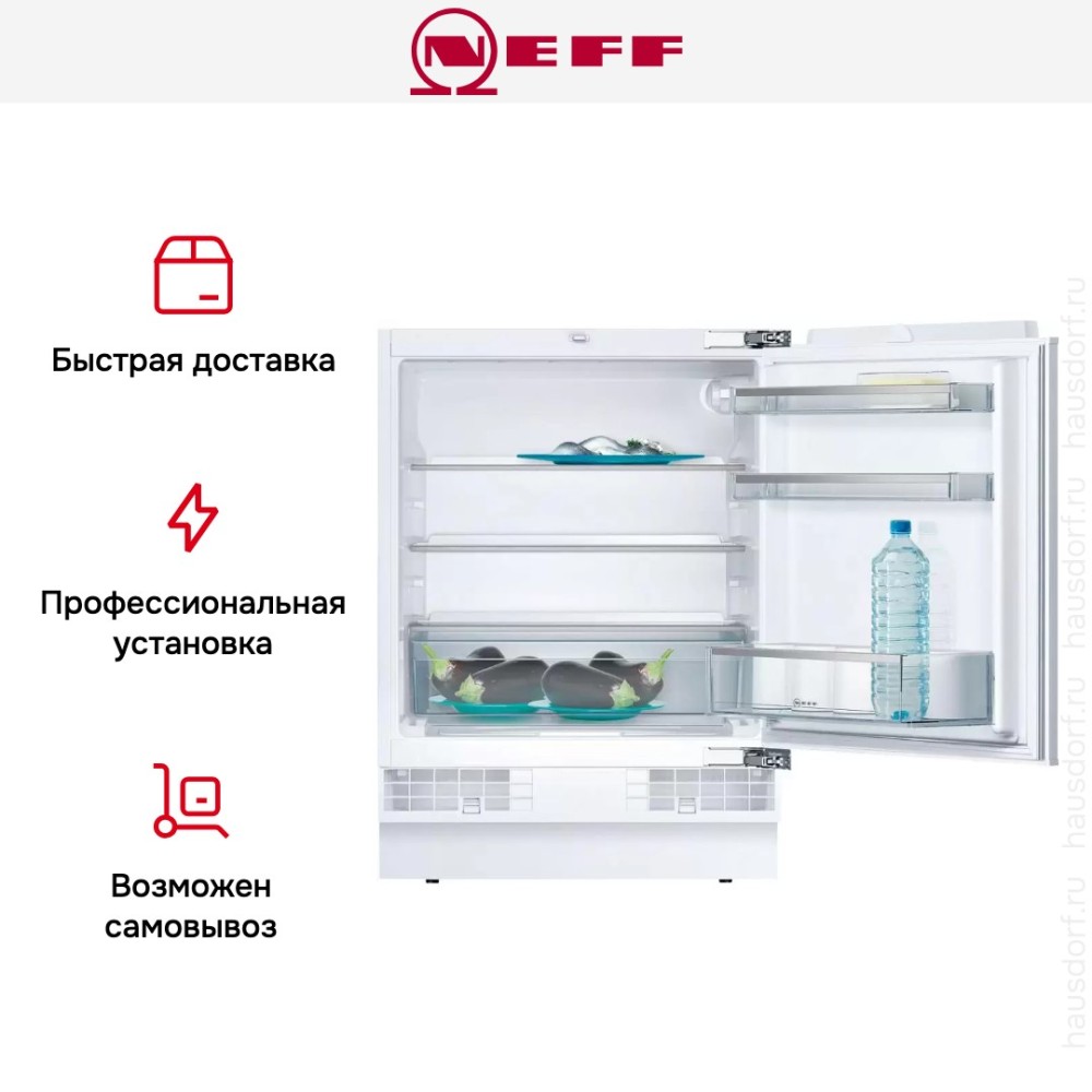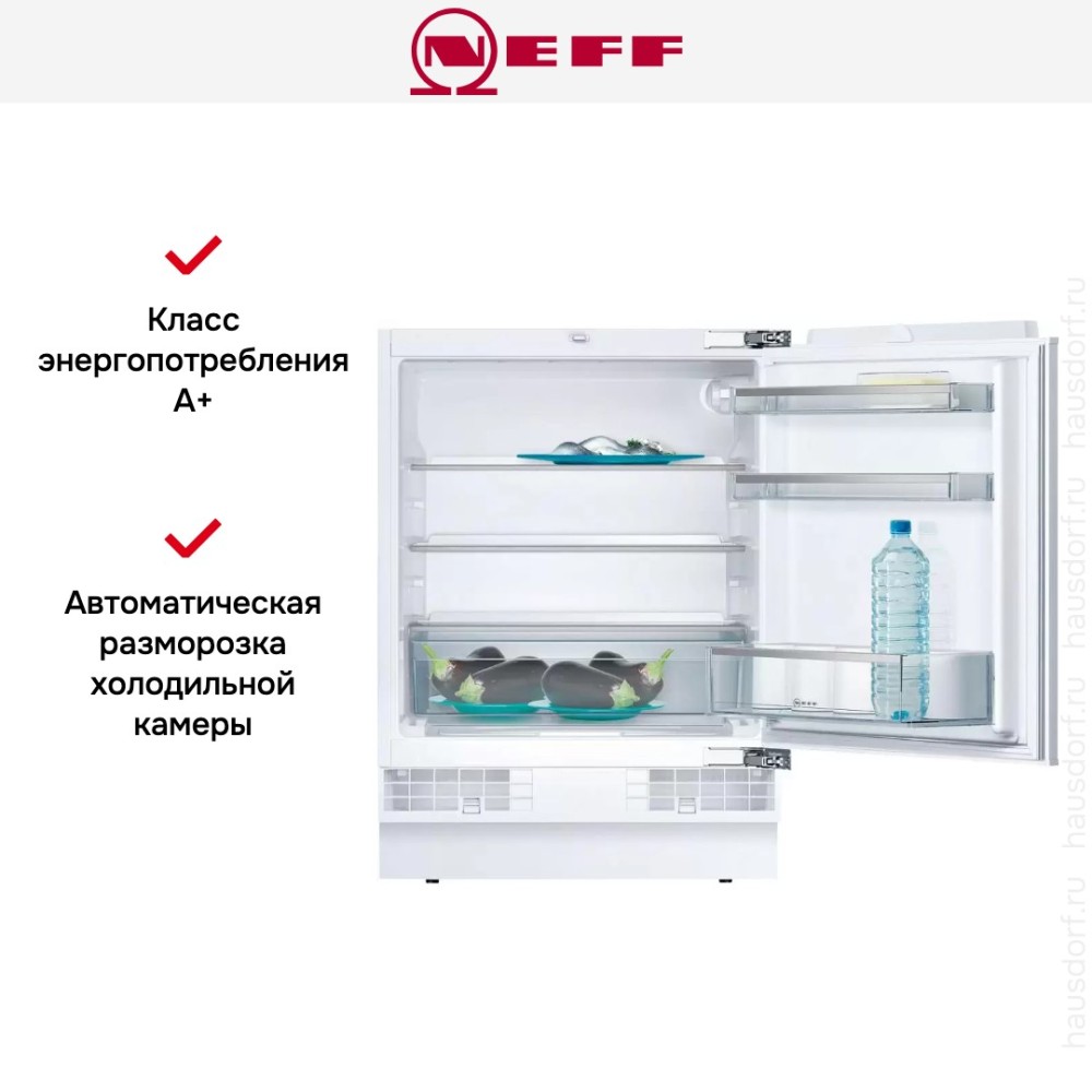 Neff K4316X7RU — компактный холодильник, встраиваемый под столешницу. Дверцу модели можно перенавесить, изменив тем самым сторону ее открывания. Высокий класс энергоэффективности A+ гарантирует экономичную эксплуатацию прибора.