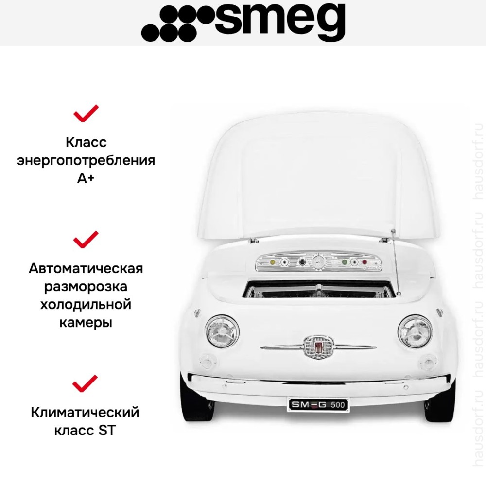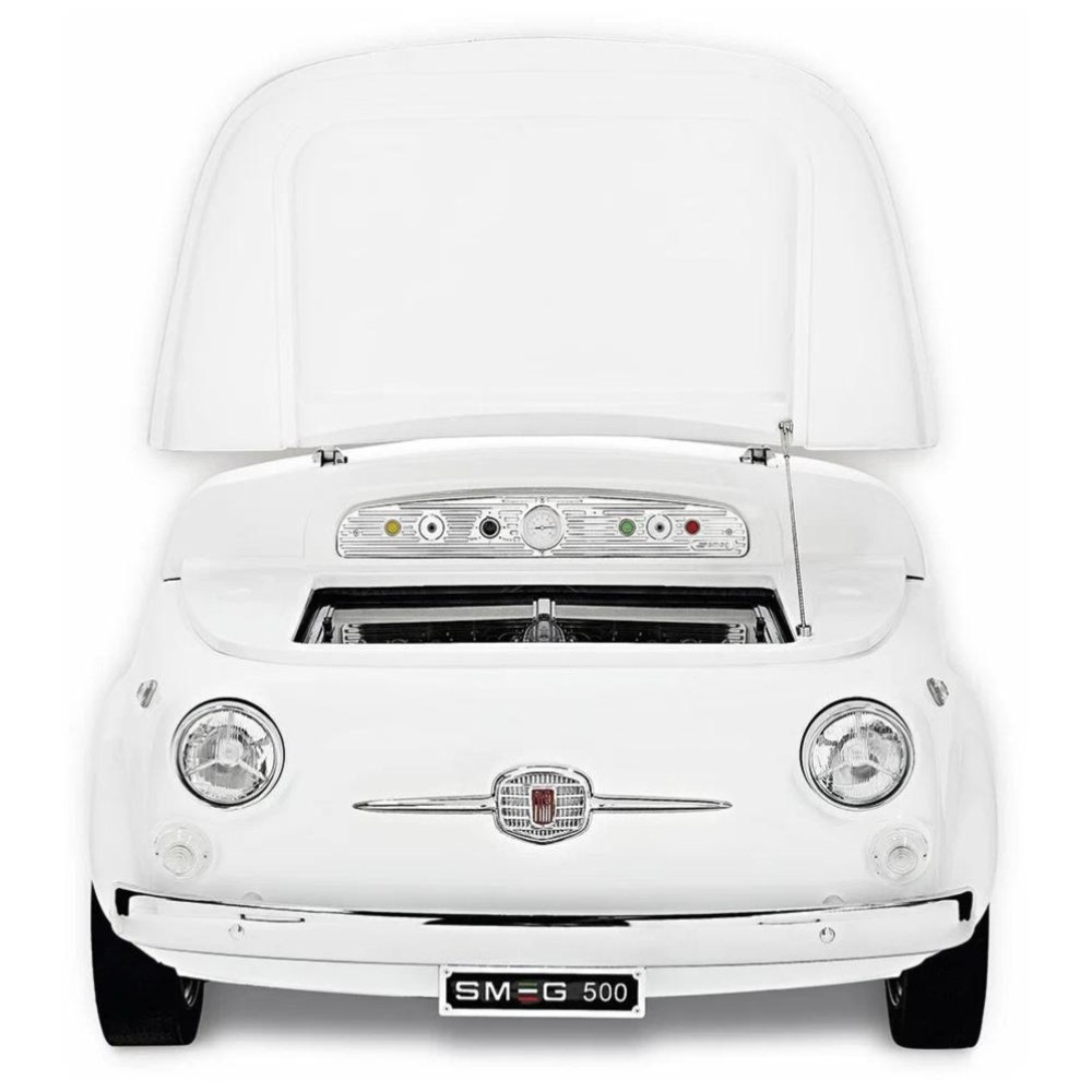 Эксклюзивный отдельно стоящий мини-бар Smeg 500B в корпусе белого цвета представляет собой имитацию известного ретро-автомобиля Фиат-500. Модель из коллекции 50-х годов оснащена системой автоматического размораживания и системой охлаждения с обдувом. Камера объемом 100 литров позволяет разместить для охлаждения бутылки в специальных съемных держателях, жестяные банки, а также масло или сыр. Температура в камере регулируется при помощи термостата.