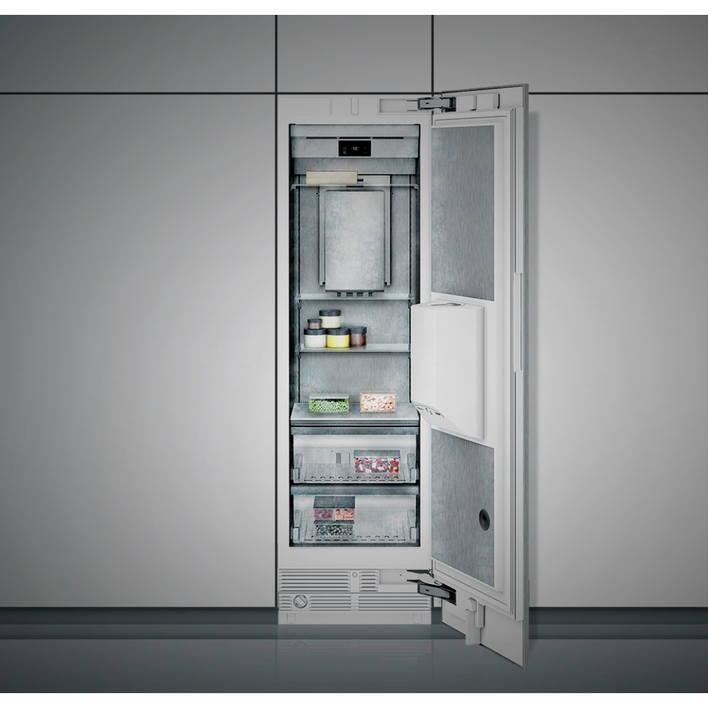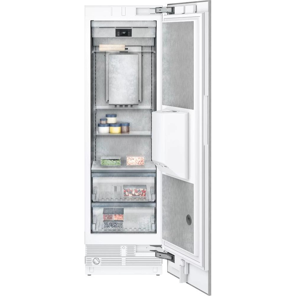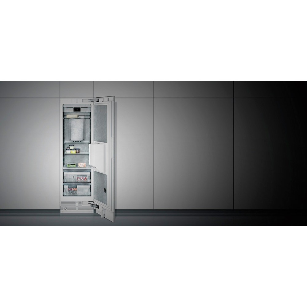 Морозильник Gaggenau встраивается в мебель, открывается с помощью ручки или автоматически. На двери расположен ледогенератор с постоянной подачей воды, режимы работы: лед, крошка и охлажденная вода. В камере установлены полки из закаленного стекла, две из них можно переставить по высоте. Цвет — нержавеющая сталь и темный антрацит.