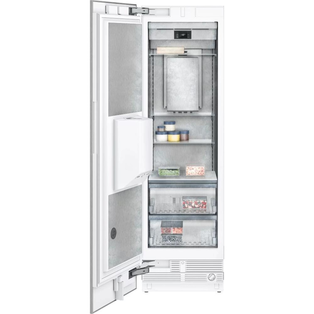 Морозильник Gaggenau встраивается в мебель, открывается с помощью ручки или автоматически. Ледогенератор с постоянной подачей воды работает в трех режимах: лед, крошка и охлажденная вода. В камере установлены полки из закаленного стекла, две из них можно переставить по высоте. Цвет — нержавеющая сталь и темный антрацит.