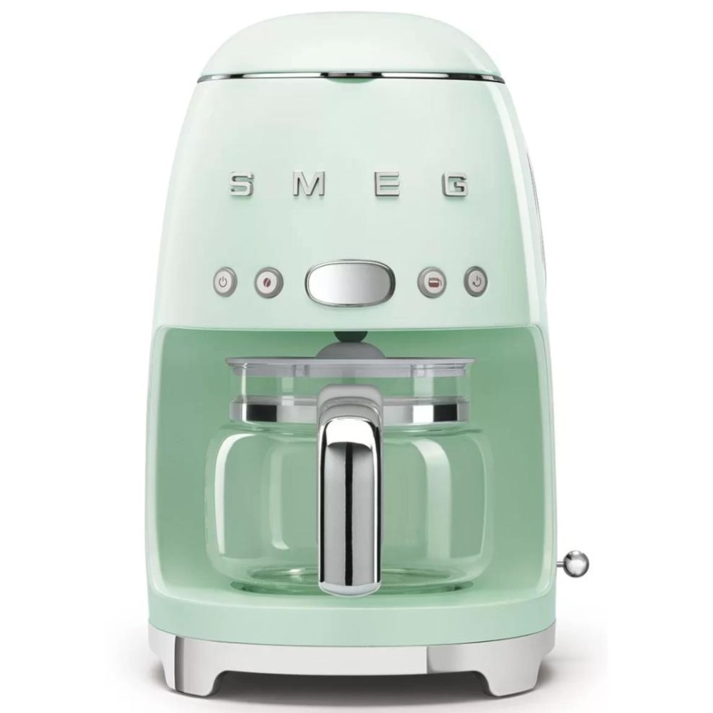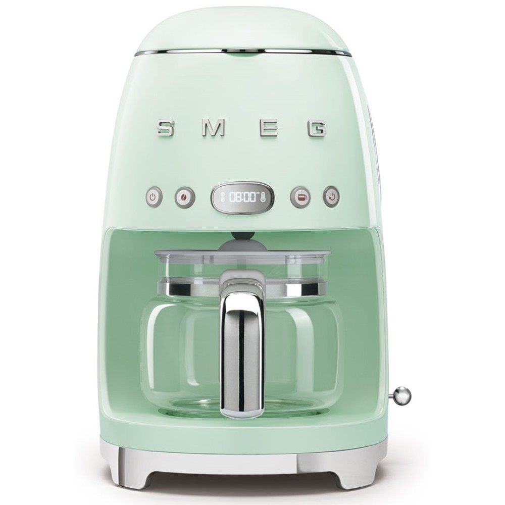 Капельная кофемашина Smeg в стиле 50-х готовит американо. Нежный пастельно-зеленый цвет делает этот прибор также украшением интерьера. В кувшин помещается до 10 порций. Можно выбрать функцию 4 чашки, чтобы сварить сколько нужно.