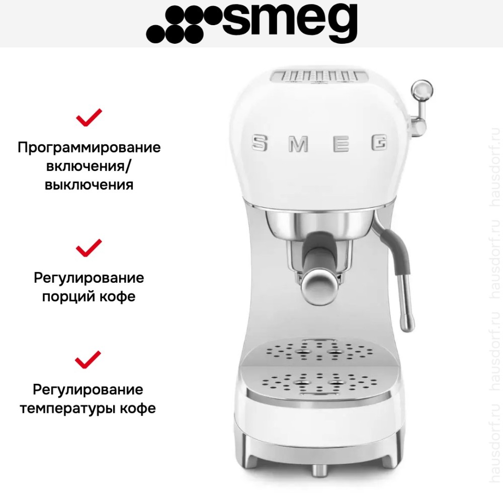 Кофемашина SMEG ECF02WHEU — это сочетание элегантности и функциональности, она воплотит ваши кофейные мечты в реальность. Дизайн в стиле 50-х годов привнесет в вашу кухню нотку ностальгии и эстетического удовольствия. Белый цвет корпуса из пластика и металлический рожок подчеркивают изысканность и простоту модели. При этом, кнопочные и поворотные переключатели обеспечивают удобство и простоту управления.