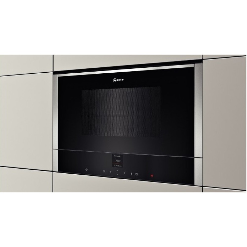 Эффектная встраиваемая микроволновая печь Neff с управлением TouchControl. Черный фасад дополняется рамкой из нержавеющей стали в современном стиле. Устройство шириной 60 см предназначается для встраивания в колонну с другой бытовой техникой — например, духовым шкафом или кофемашиной. Элементы управления расположены в нижней части фасада, что позволяет встраивать эту модель на любой удобной высоте. Цветной дисплей диагональю 2,5 дюйма позволяет контролировать время приготовления и затраты электроэнергии. Программатор SHIFT CONTROL предназначается для переключения режимов и задания дополнительных параметров одним нажатием кнопки.