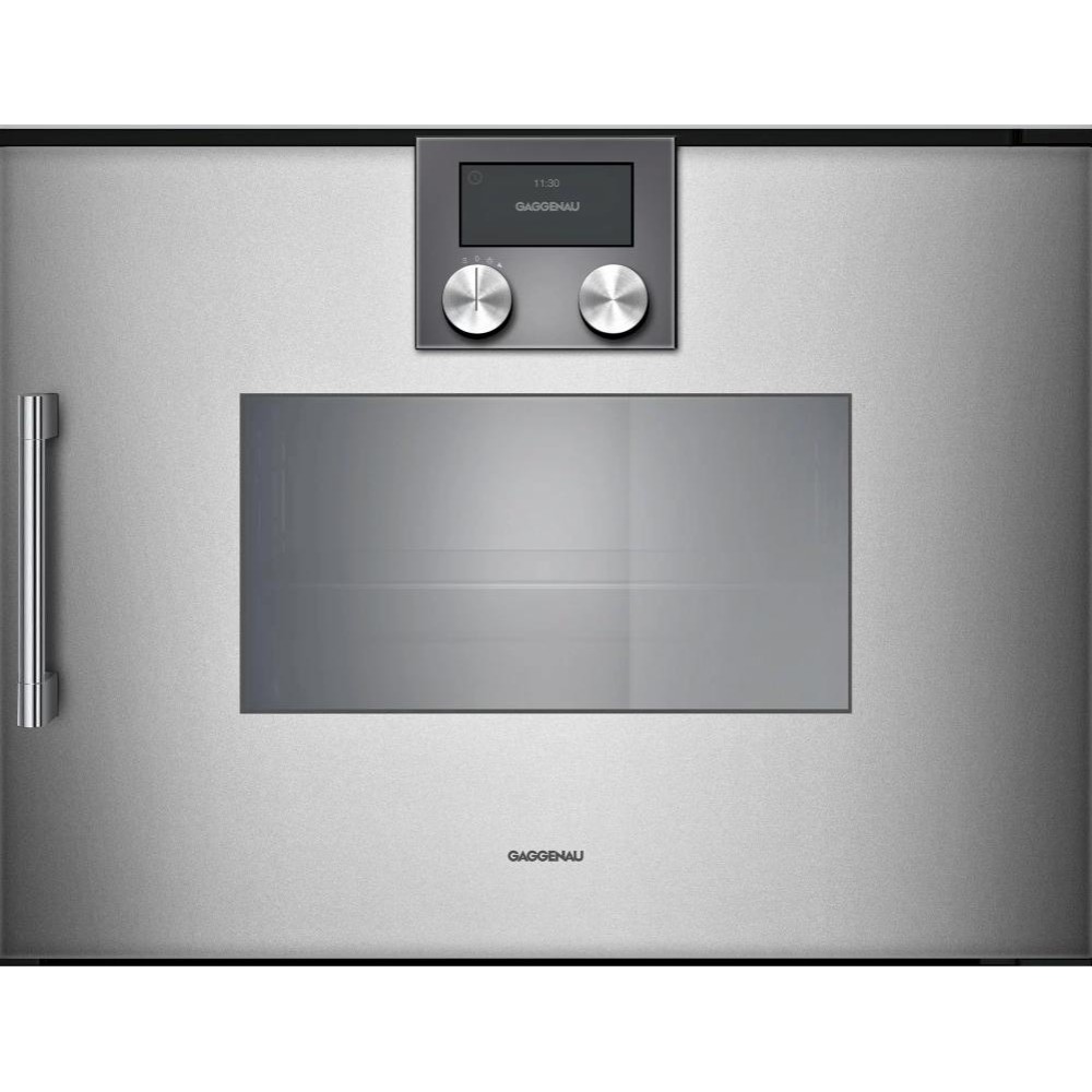 Gaggenau BSP220111 — встраиваемая пароварка с внешней генерацией пара. Рабочая камера выполнена из нержавеющей стали, предусмотрены 4 уровня направляющих для противней и LED-освещение. Управляется с помощью поворотных переключателей и сенсорного TFT-дисплея, где отображаются индикаторы температуры и уровня воды.