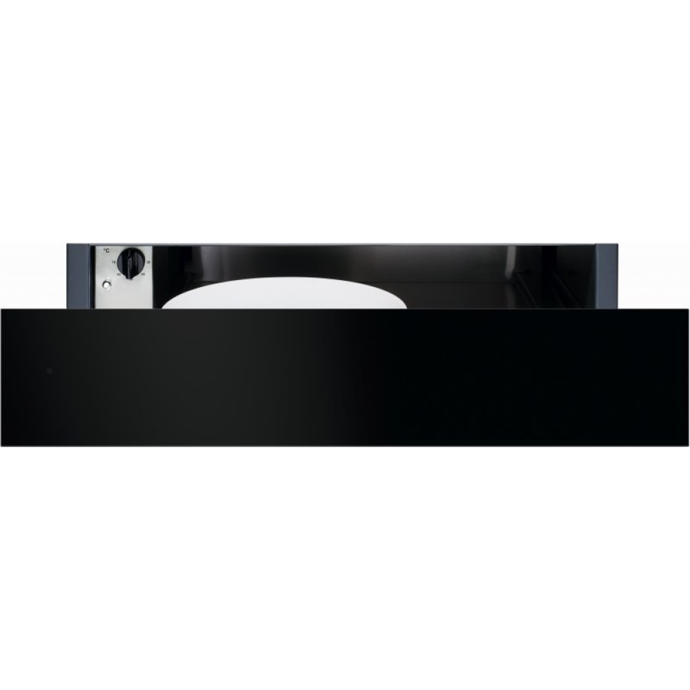 Фронтальная часть выполнена в универсальном черном цвете, что позволяет разместить ее в кухне любого стиля. Гладкий фасад без ручки не имеет выступающих частей: для открытия нужно просто нажать на него. Ящик выдвигается легко и плавно, что исключает повреждение посуды — для этого предусмотрен доводчик дверцы с амортизатором и система направляющих Quadro. Внутренняя поверхность камеры изготовлена из закаленного стекла, выдерживающего значительные нагрузки. Вся посуды нагревается равномерно благодаря улучшенной системе вентиляции.