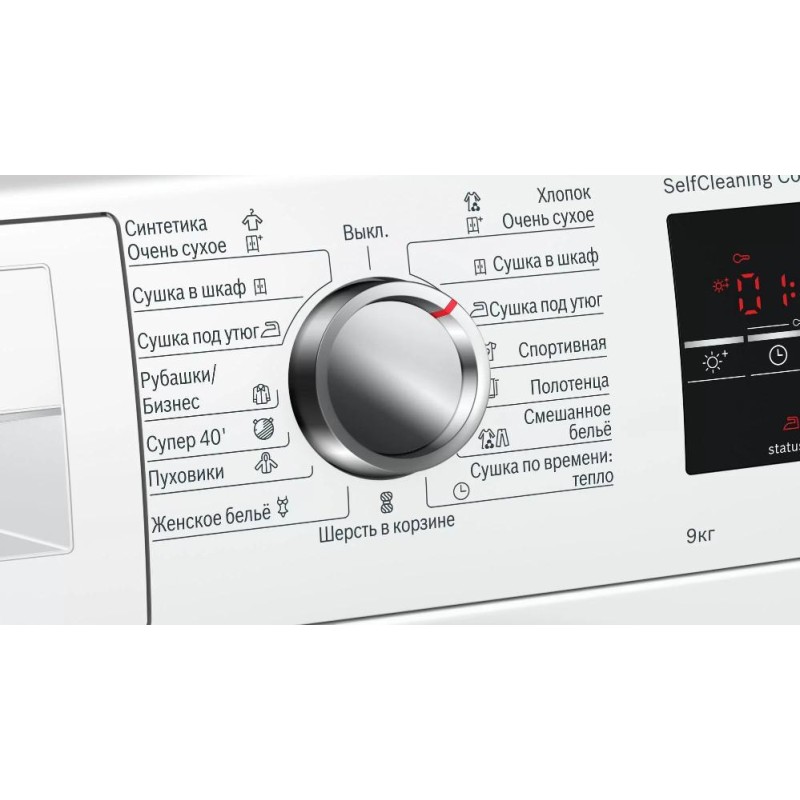 - Клавиши специальных функций:Выбор степени сушки Выбор времени сушки Выбор времени до окончания сушки Установка отсрочки старта / задержка запуска программы Снижение нагрева Легкое глаженье / антисминание Включение и отключение сигнала Старт / пауза