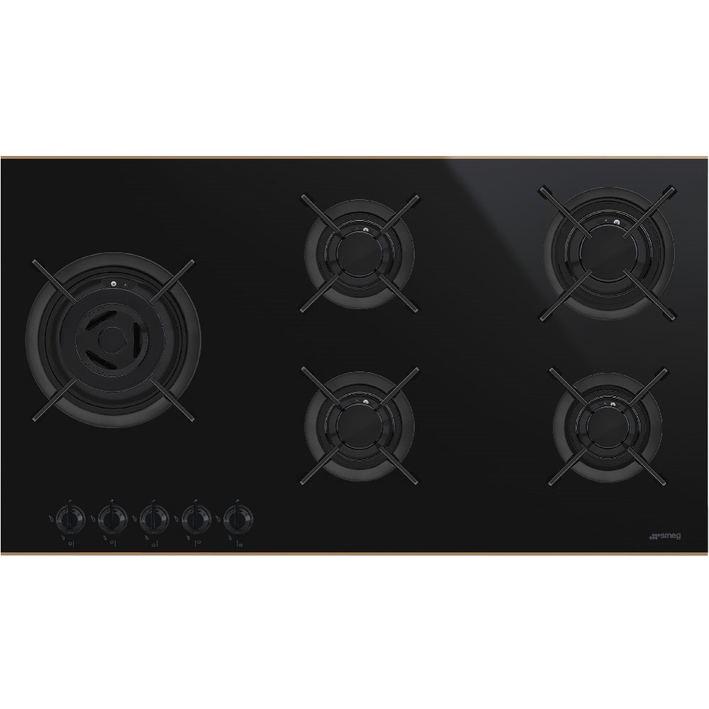 Smeg PV695LCNR — стеклокерамическая варочная панель с пятью конфорками различного уровня мощности. Модель дополнена чугунными держателями для посуды и поворотными переключателями черного цвета. Защита от утечки газа и атоподжиг горелок гарантируют полностью безопасную эксплуатацию устройства. Газовый контроль прекращает подачу газа к конфорке в случаях, когда пламя погасло, например, от сквозняка. Датчики фиксируют отсутствие огня и через несколько секунд происходит блокировка.