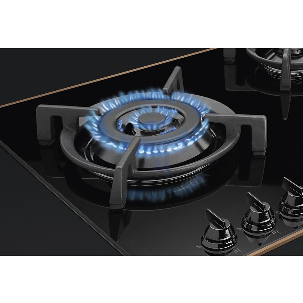 Автоматический поджиг интегрирован в каждую ручку и активируется при ее повороте. Регуляторы занимают левое положение, что удобно при настройке работы. Плавный ход позволяет точно регулировать мощности и фиксировать нужные значения. Большая конфорка сокращает время приготовления, так как быстро доводит жидкость до кипения. Данную горелку можно также использовать для приготовления в посуде wok. Среди преимуществ: газ-контроль, WOK-конфорка, автоматический электроподжиг.