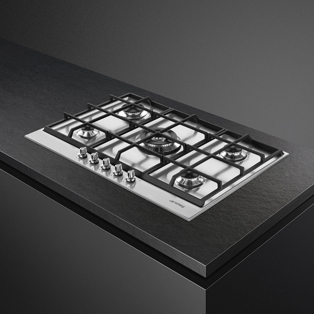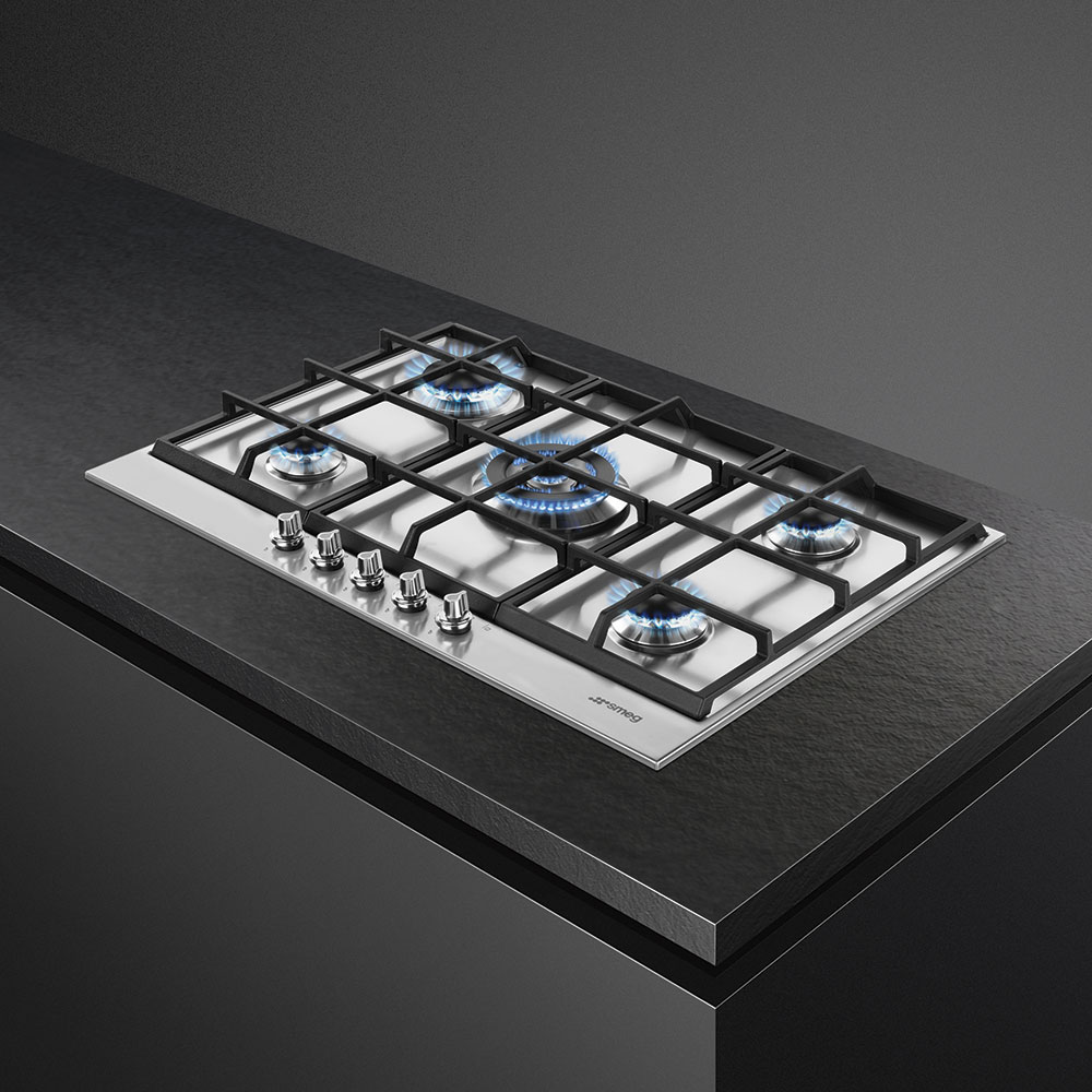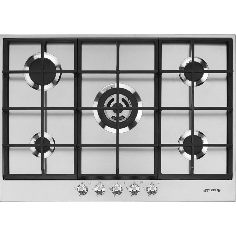 Варочная поверхность шириной 72 см, оснащенная пятью конфорками, устанавливается на столешницу сверху. В центре располагается ультрабыстрая конфорка мощностью 4 кВт для быстрого разогрева, закипания воды или интенсивной жарки. Блестящие механические поворотные переключатели обеспечивают плавную бесступенчатую регулировку мощности пламени. Алюминиевые горелки Smeg Contemporanea отличаются вертикальным направлением пламени, которое способствует быстрому нагреву. Страна производства — Италия, на модель выдается официальная гарантия производителя сроком на 24 месяца.