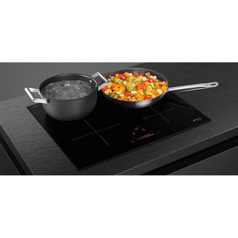 Независимая варочная поверхность с четырьмя зонами нагрева изготовлена из черной стеклокерамики с прямым краем, она может устанавливаться сверху или вровень со столешницей. Панель управления, расположенная на фронтальной части, оснащена удобным слайдером для выбора мощности нагрева одним касанием. На ней находятся также красные индикаторы остаточного тепла, времени приготовления и уровня мощности для каждой зоны нагрева. Таймер позволяет задать время приготовления от 1 до 99 минут, затем нагрев автоматически отключается, а о готовности блюда оповещает звуковой сигнал. Функция определения диаметра посуды позволяет пользоваться кастрюлями или сковородами разного размера: нагреваться при включении будет именно та часть рабочей зоны, которой касается дно посуды. Функция интенсивного нагрева Booster позволяет на определенный промежуток времени увеличить мощность зоны нагрева, а затем автоматически снижает ее до заданного уровня. Устройство оснащено двумя конфорками диаметром 210 мм и мощностью 2,3 кВт и двумя экономичными конфорками диаметром 160 мм и мощностью 1,85 кВт. Модель производится в Италии, официальный срок гарантии составляет 24 месяца.