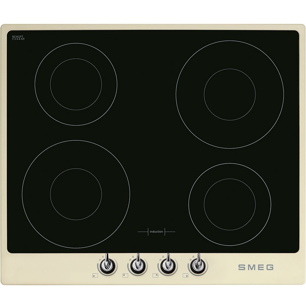 Индукционная варочная панель с 4 конфорками разного диаметра и усилением мощности Booster. Серия Victoria: черная поверхность с кремовой рамкой и поворотными переключателями с эффектом нержавеющей стали. Защищена от перегрева и сбоя настроек благодаря автоматическому отключению и блокировке управления.