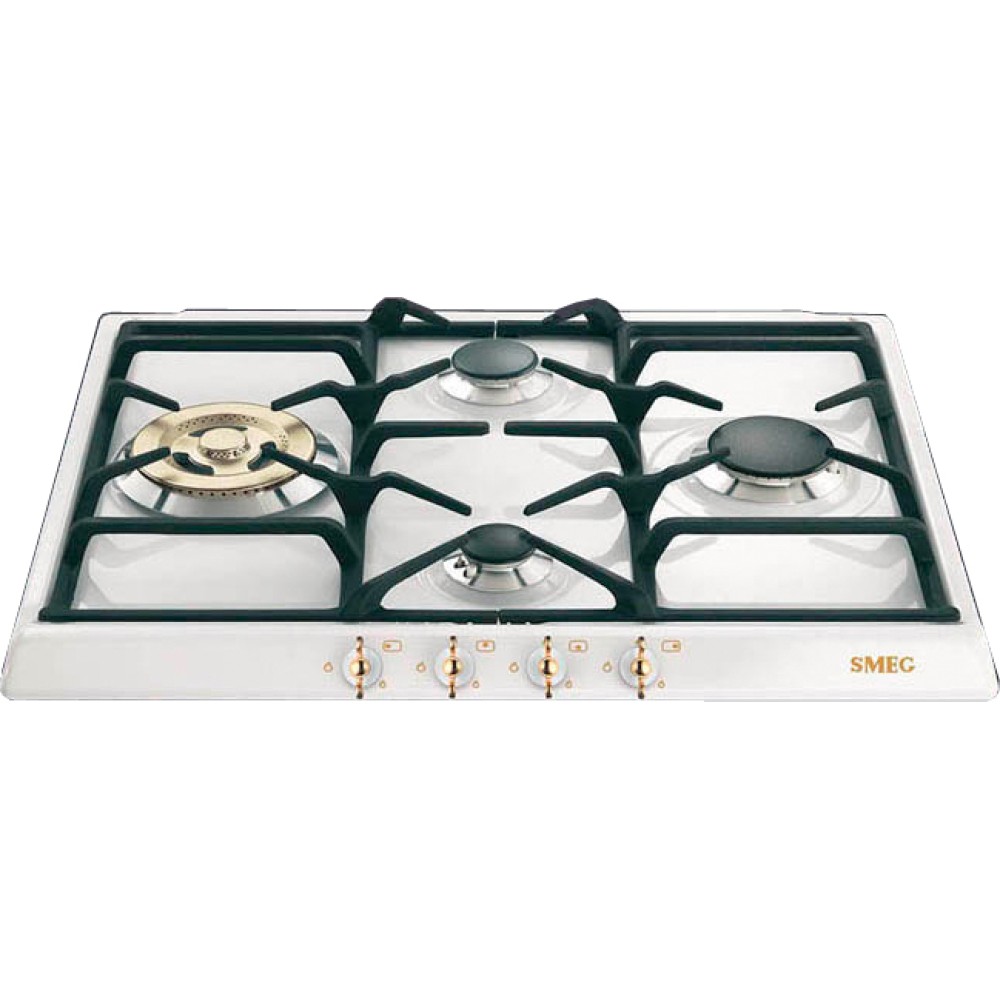 Газовая варочная панель с эмалированной поверхностью выполнена в белом цвете и дополнена золотистой фурнитурой. Всего представлено четыре конфорки. Расположение ромбом обеспечивает удобную расстановку посуды, даже если будут задействованы все зоны нагрева одновременно.