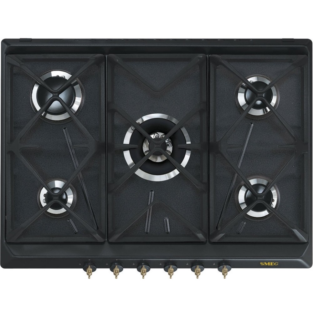 Smeg SRV876AOGH — элегантная варочная поверхность в цвете антрацит. Модель снабжена системами автоподжига и газового контроля, гарантирующими ее безопасную эксплуатацию. Центральная конфорка типа «Двойная корона» обеспечивает максимально мощный и равномерный нагрев, что значительно сокращает время приготовления или разогрева пищи.