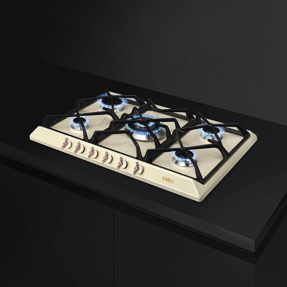 Smeg SRV876POGH — независимая варочная панель с эмалированной рабочей поверхностью кремового цвета. К особенностям модели относится наличие ультрабыстрой конфорки с двойным управлением, при помощи которой можно максимально быстро вскипятить большое количество жидкости или подогреть готовое блюдо.