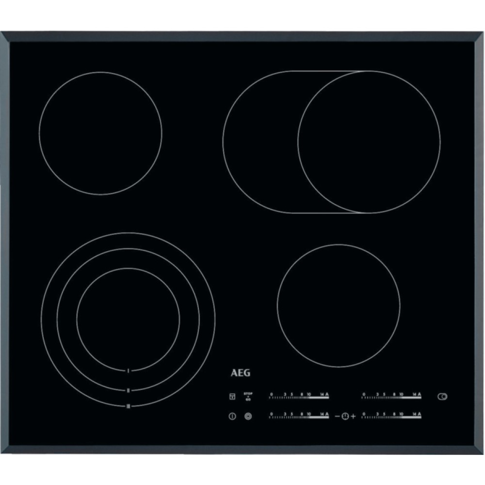 AEG HK565407FB — электрическая варочная поверхность независимого типа установки. Специальная система крепления OptiFix гарантирует удобное и простое встраивание в столешницу. Модель можно установить над ящиком в кухонной тумбе благодаря съемной нижней части ProBox, защищающей мебель от перегрева. Черная стеклокерамика со скошенным краем гигиенична и нетребовательна в уходе. Модель из серии RADIANT HOB оснащена усовершенствованной сенсорной панелью управления с четырьмя слайдерами прямого доступа: изменить мощность нагрева можно одним касанием.