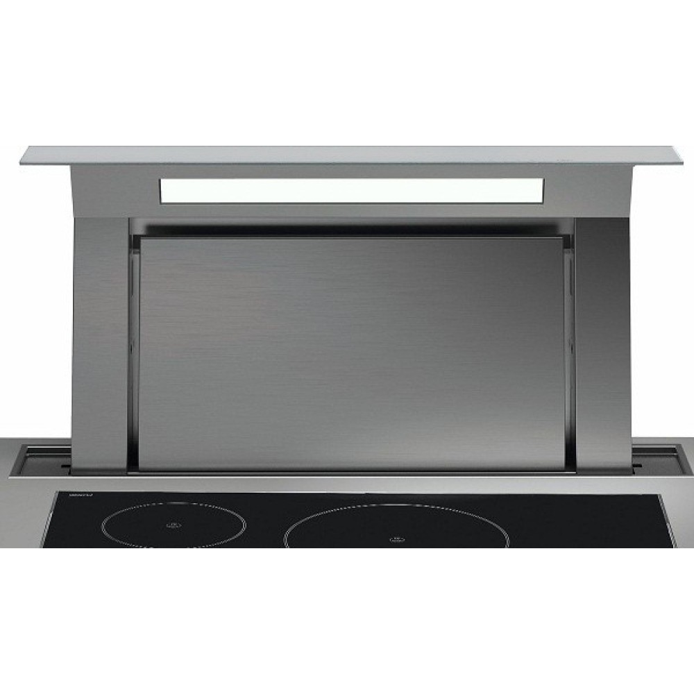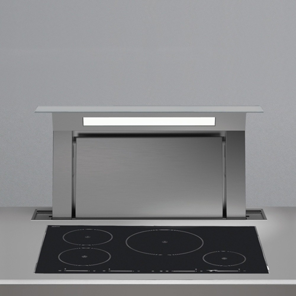 Встраиваемая итальянская вытяжка Falmec Down Draft 120 ix ECP из полированной нержавеющей стали с периметральным втягиванием оснащается встроенной неоновой подсветкой.
