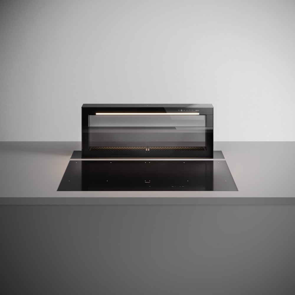 Встраиваемая вытяжка — выбор тех, кто хочет максимально задекорировать технику, или владельцев маленькой кухни. Тип встраивания: в стол. Обратите внимание на цветовые сочетания модели Falmec LEVEL, чтобы органично вписать ее в свою квартиру. Оттенок корпуса: черный матовый. Благодаря лампочкам, которые расположены на нем, можно освещать плиту и столешницу рядом, чтобы готовить было еще проще и приятнее. Фишка этой техники — выдвижная панель.