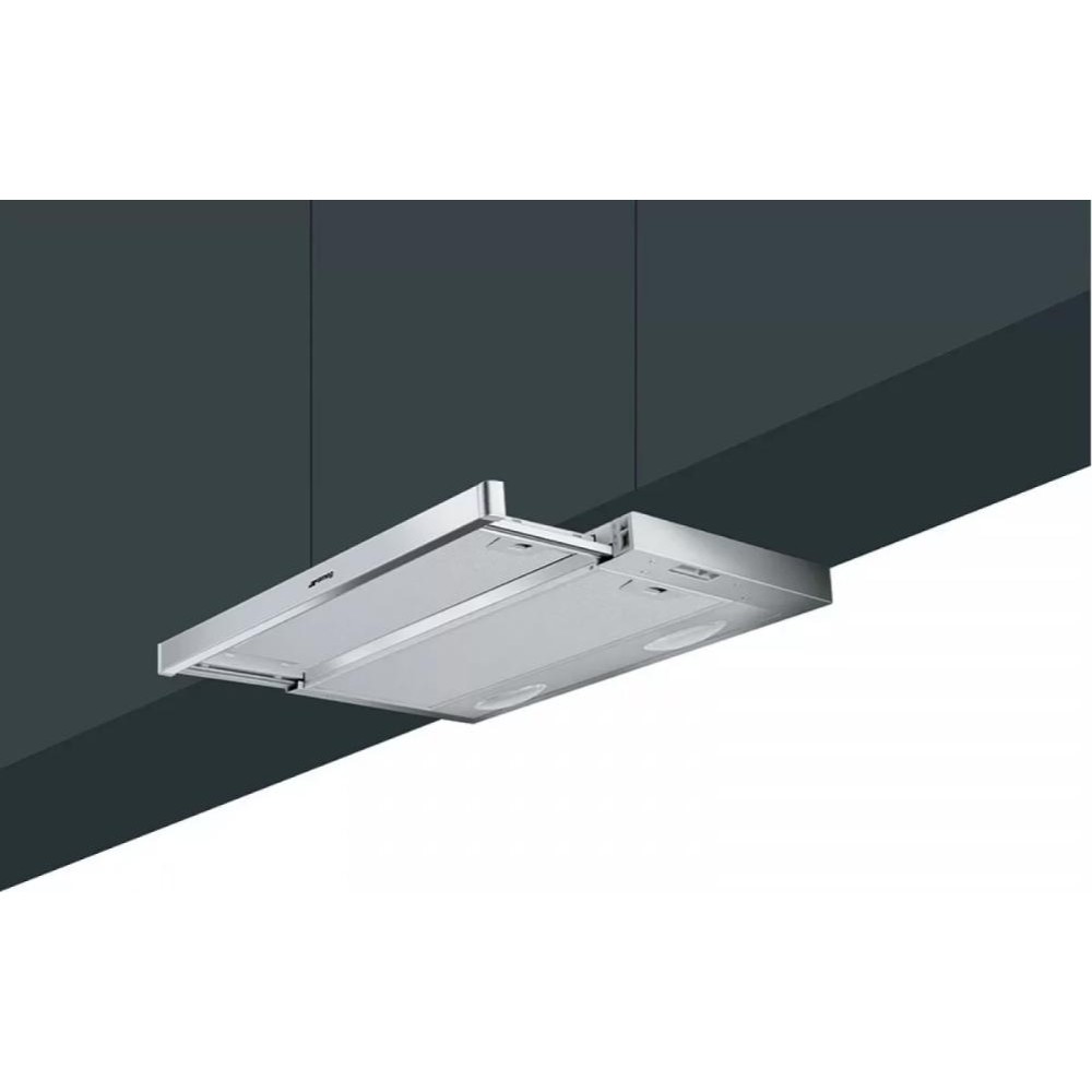 Модель шириной 60 см производится в Италии и относится в основной линейке. Серебристый цвет корпуса позволит установить ее в кухне любого стиля, а встроенная конструкция и небольшая производительность 310 м3/ч рассчитаны на использование в малогабаритном помещении. Модель оснащена удобным выдвижным экраном, увеличивающим площадь забора загрязненного воздуха. Для работы в режиме отвода воздуха за пределы помещения требуется присоединения к вентиляционной системе при помощи воздуховода диаметром 120 мм. При помощи слайдерного управления можно выбрать одну из трех скоростей работы. Минимальная скорость применяется для непрерывной очистки воздуха при небольших загрязнениях. Средняя скорость является самой востребованной — она сочетает быструю очистку воздуха и невысокий уровень шума. Максимальная скорость включается при интенсивной готовке — например, жарении. Для освещения рабочего места используются две светодиодные лампы. Жироулавливающие фильтры изготавливаются из алюминия и снимаются для очистки в посудомоечной машине или под струей воды. Имеется возможность установка сменного угольного фильтра для устранения неприятных запахов.