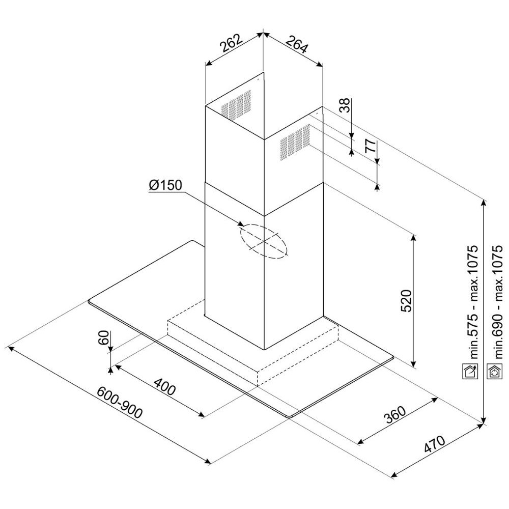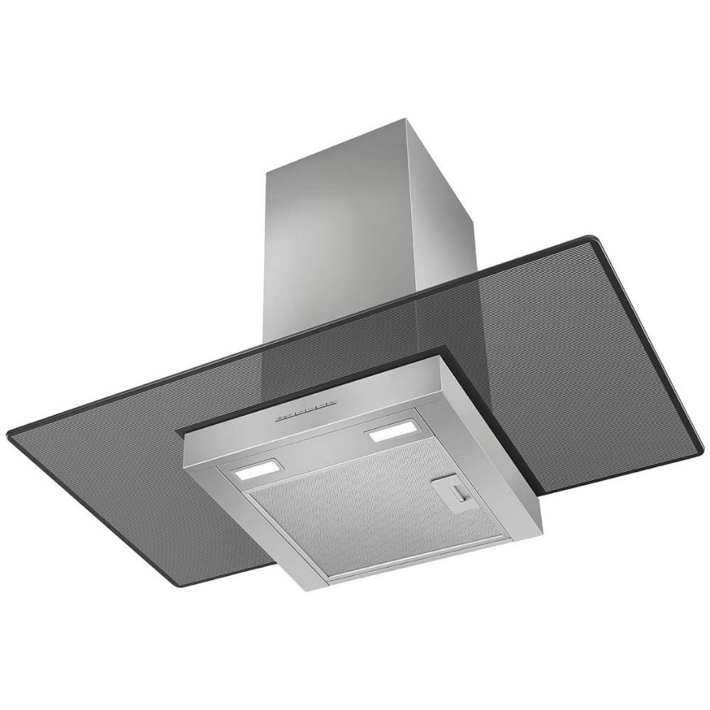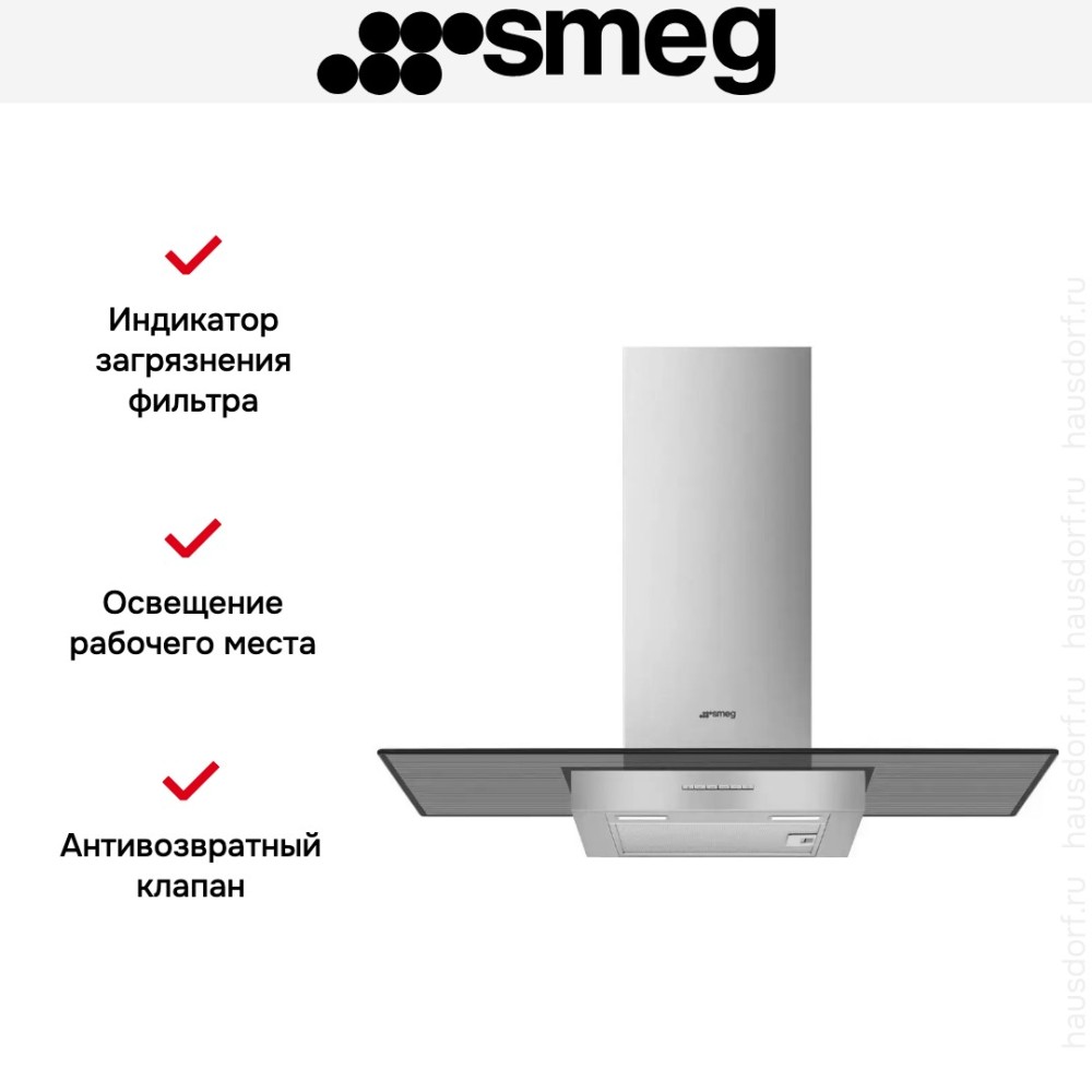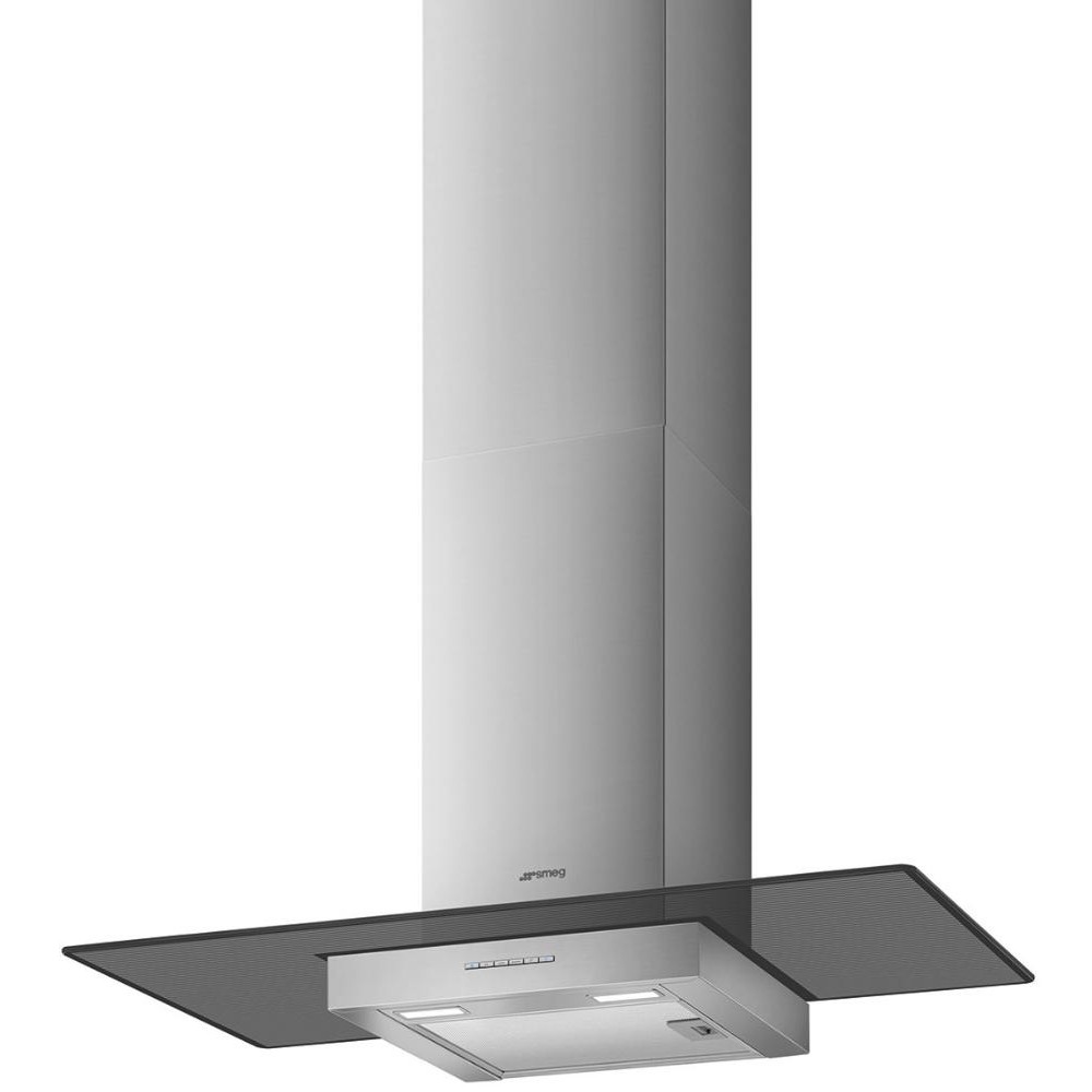Вытяжка Smeg сделана из нержавеющей стали, перпендикулярно воздуховоду установлен широкий стеклянный экран, который покрывает даже нестандартную варочную панель. Данную модель необходимо разместить на стене на определенном расстоянии от рабочей поверхности (обратите внимание — все параметры перечислены в инструкции).