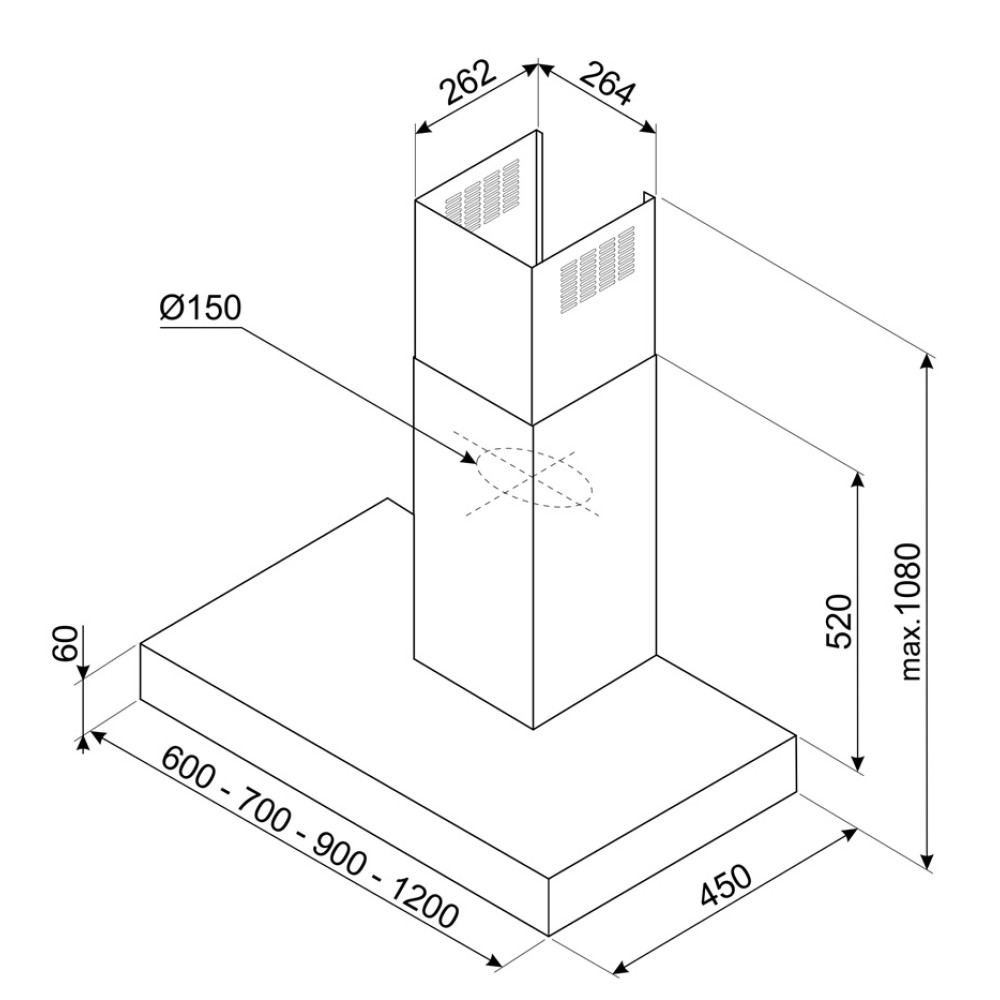 Вытяжка может устанавливаться над варочной панелью с пятью или шестью конфорками, на расстоянии не менее 50 см. Корпус устройства выполнен в цвете нержавеющей стали. Максимальная производительность составляет 713 м3/ч — такая модель способна быстро очистить воздух в помещении большой площади. Устройство предназначается для работы в двух режимах: отвода воздуха с присоединением к системе вентиляции, и рециркуляции с очисткой воздуха в помещении при помощи системы фильтров. Три алюминиевых жироулавливающих фильтра входят в комплект, их можно без труда снимать для периодической очистки, о необходимости которой сообщают индикаторы загрязнения. Угольный фильтр приобретается отдельно. Панель управления оснащена кнопками переключения скоростей. Для выбора интенсивного режима с очисткой особенно загрязненного воздуха предназначено отдельная кнопка, время работы в этом режиме составляет 5 минут, по истечении которых она переключается на скорость 3. Таймер предусматривает автоматическое отключение вытяжки через 15 минут. Класс энергопотребления A свидетельствует об экономичной работе. Для освещения рабочей зоны используются 2 LED-лампы мощностью 1 Вт.