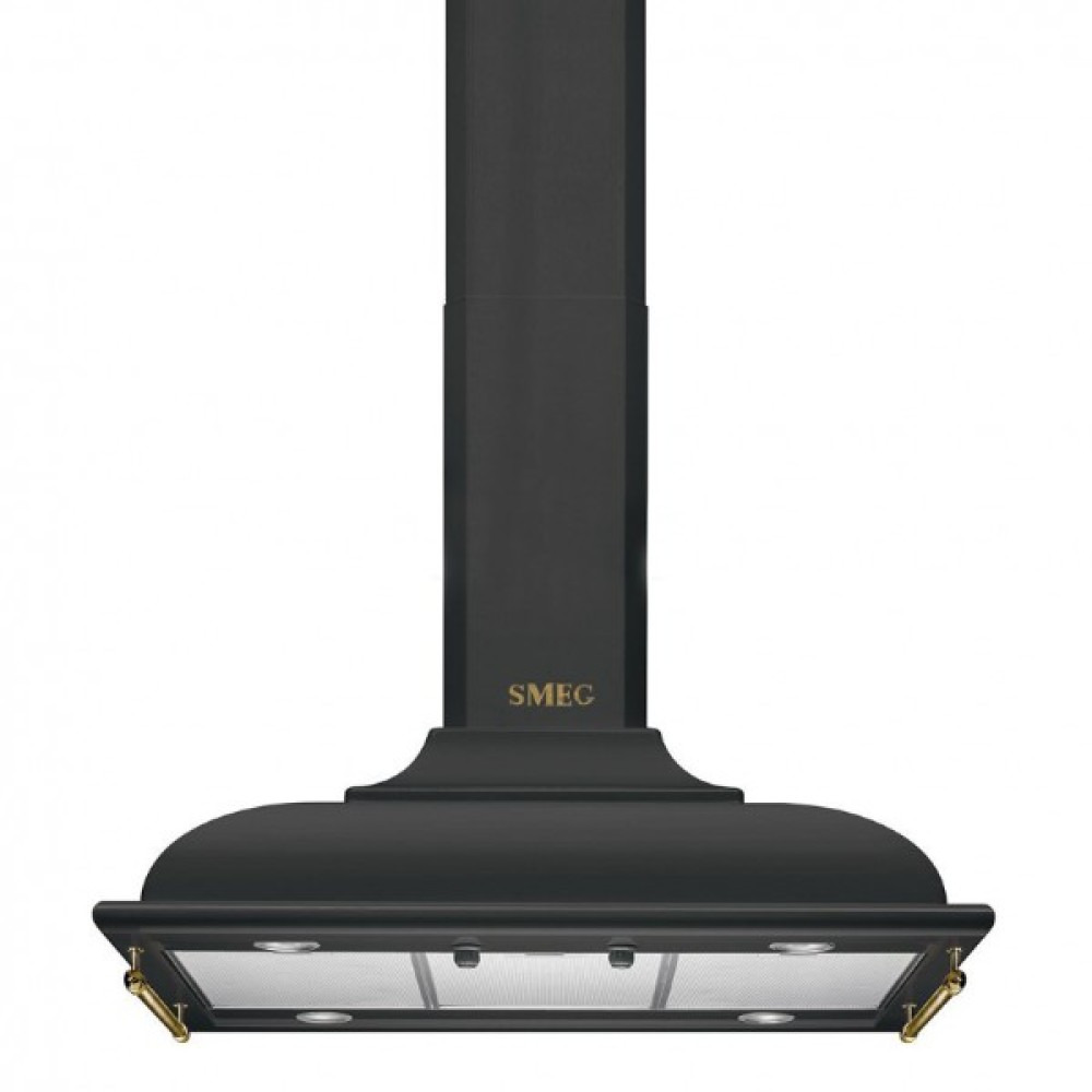 Модель в цвете антрацит дополняет стильная латунная фурнитура, при желании ее можно поменять на фурнитуру оттенка «состаренное серебро». Заметный логотип и боковые релинги закрывают монтажные отверстия в корпусе. Вытяжка шириной 90 см может устанавливаться над большими варочными поверхностями на пять или шесть конфорок. Максимальная производительность составляет 754 м3/час, что позволяет использовать прибор в помещениях большой площади. Островная модель крепится к потолку и может размещаться над кухонным островом: удобству использования способствует яркое светодиодное освещение с помощью четырех ламп мощностью 1 Вт. Устройство предназначается для работы в режимах отвода и рециркуляции. Интенсивный режим позволяет произвести быструю очистку воздуха или справиться с сильным задымлением. Диаметр воздуховода, который необходим в режиме отвода для удаления грязного воздуха за пределы помещения, равен 150 мм. Режим рециркуляции предполагает дополнительную установку угольного фильтра для защиты от неприятных запахов. Три жироулавливающих фильтра идут в комплекте, они изготовлены из алюминия и пригодны для мытья вручную или в посудомоечной машине.