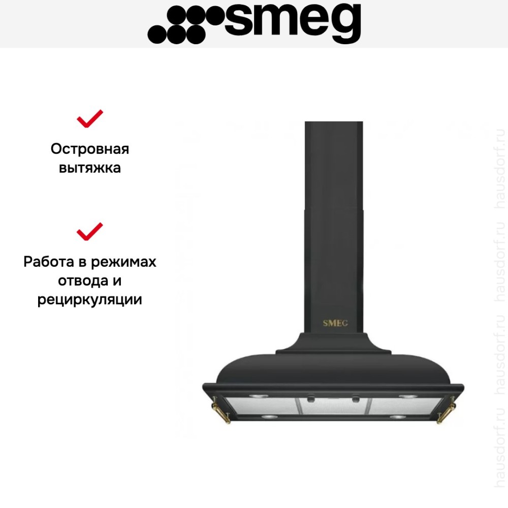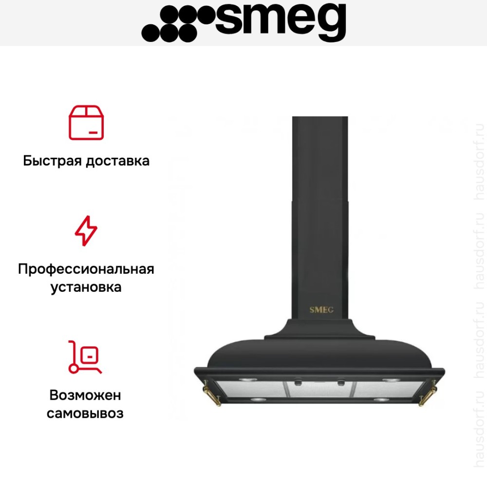 | Дополнительные возможности | Угольный фильтр Smeg FLT6 Логотип серебристый Smeg KITLOGOCR Набор аксессуаров, фурнитура серебристая (боковые релинги + логотип) Smeg KITKCX Набор аксессуаров, фурнитура состаренное серебро (боковые релинги + логотип) Smeg KITKCS Логотип состаренное серебро Smeg KITLOGOAS |