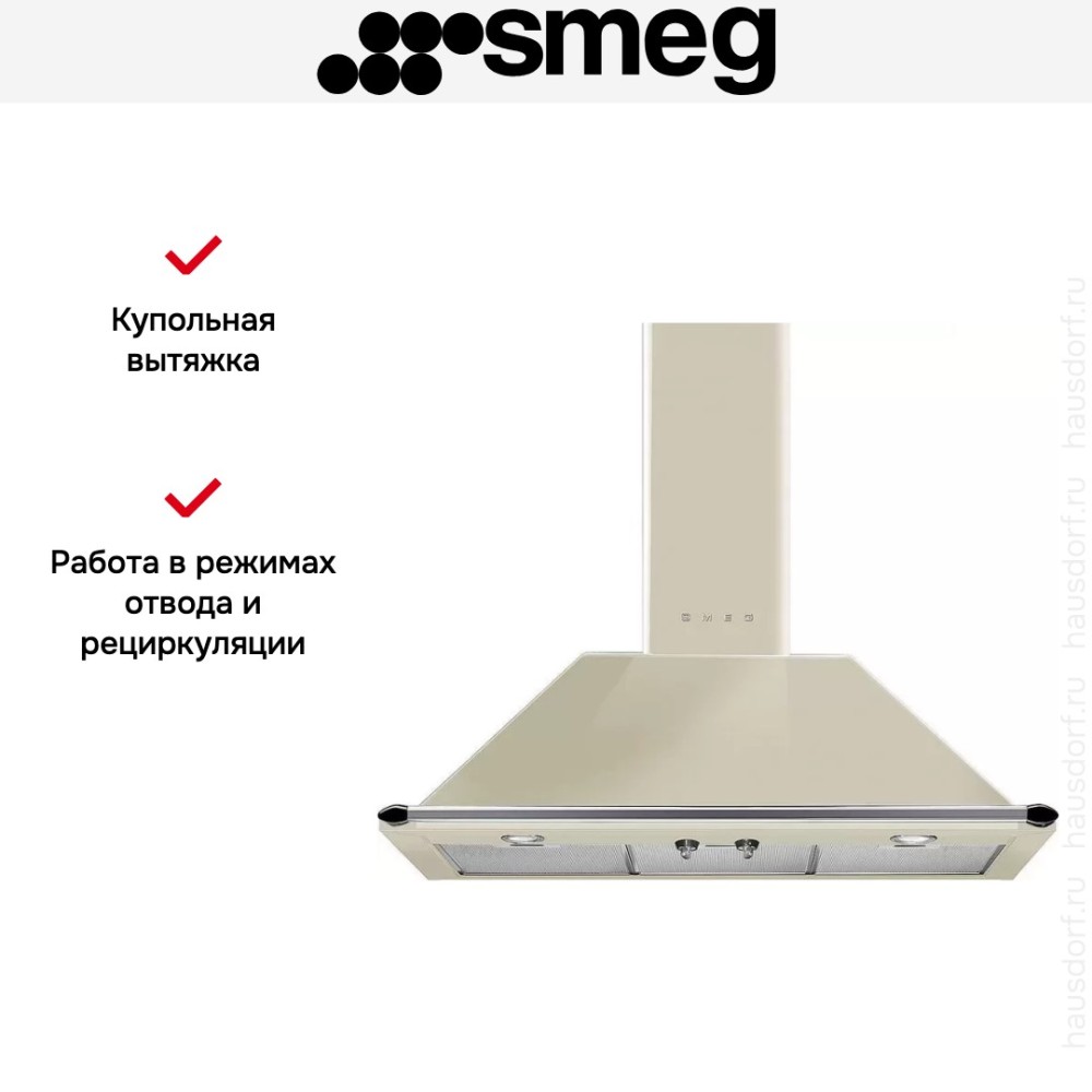 Модель серии Victoria от Smeg. Поворотные переключатели прибора плавно регулируют режимы работы, а яркое светодиодное освещение исключает необходимость дополнительной подсветки. Алюминиевый жироулавливающий фильтр долговечен и не требует замены.