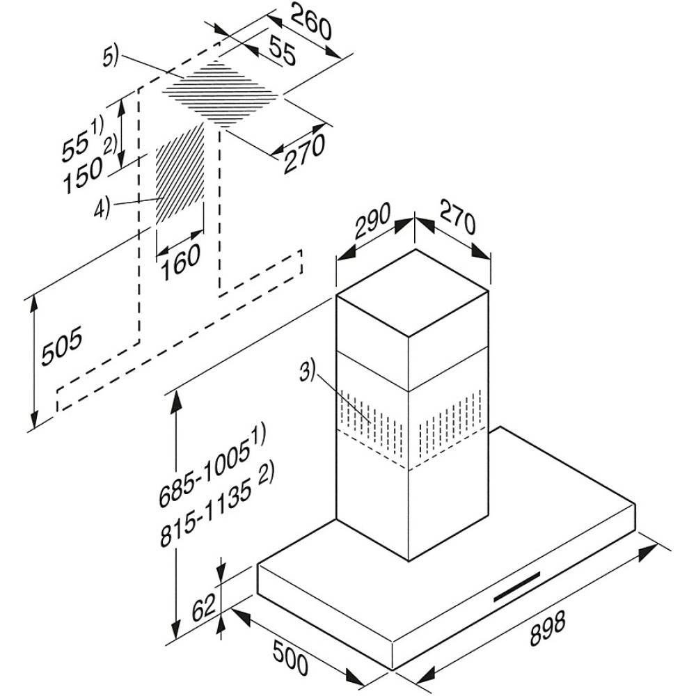 Устройство Т-образной формы шириной 90 см способно работать в двух режимах: отвода воздуха с подключением к системе вентиляции и рециркуляции с очисткой воздуха непосредственно в помещении. Максимальной производительности 650 м³/час на интенсивной ступени достаточно для быстрой очистки воздуха даже в просторной кухне. Всего предусмотрено три скоростных режима для разных уровней загрязненности. Интенсивный режим очищает воздух от самых сильных загрязнений, время его автоматического отключения можно задать при помощи таймера. Корпус прибора изготовлен из прочной и устойчивой к температурным колебаниям нержавеющей стали. Три жироулавливающих фильтра без труда извлекаются для очистки, они полностью пригодны для мытья в посудомоечной машине. Три мощные светодиодные лампы служат для освещения рабочей зоны. Мотор с двусторонним всасыванием отличается экономичностью и соответствует классу энергоэффективности А. Уровень шума на первой ступени составляет всего 47 дБ. При слишком длительной работе или при перегреве прибора срабатывает защитное отключение. Режим рециркуляции может использоваться при дополнительной установке угольного фильтра.