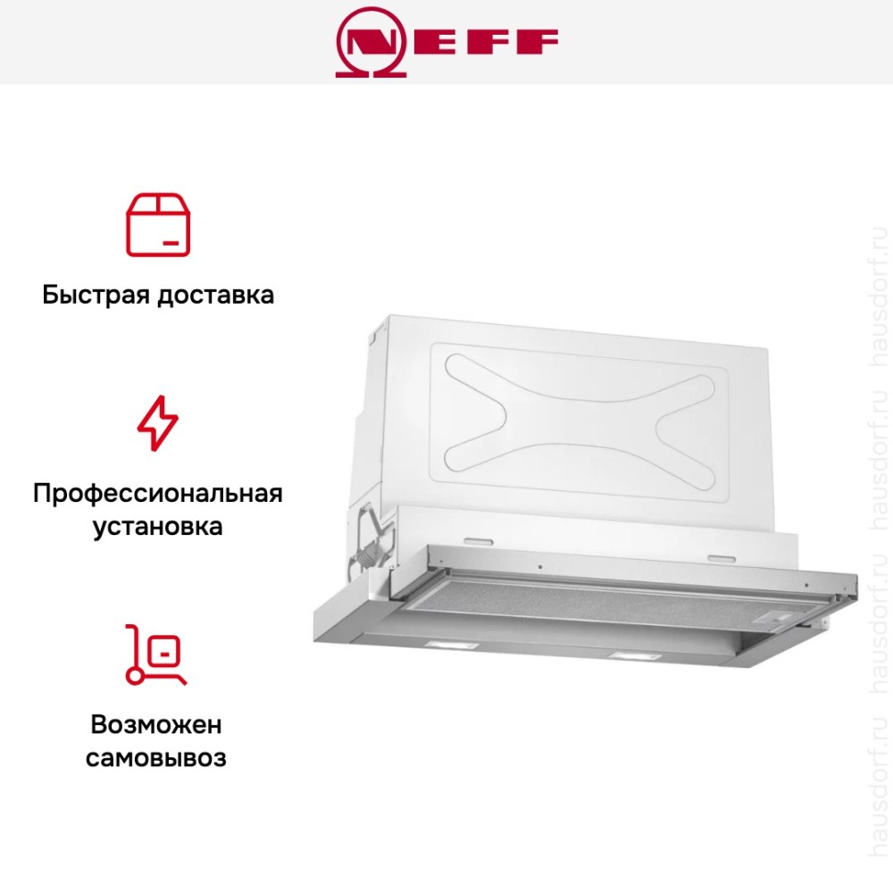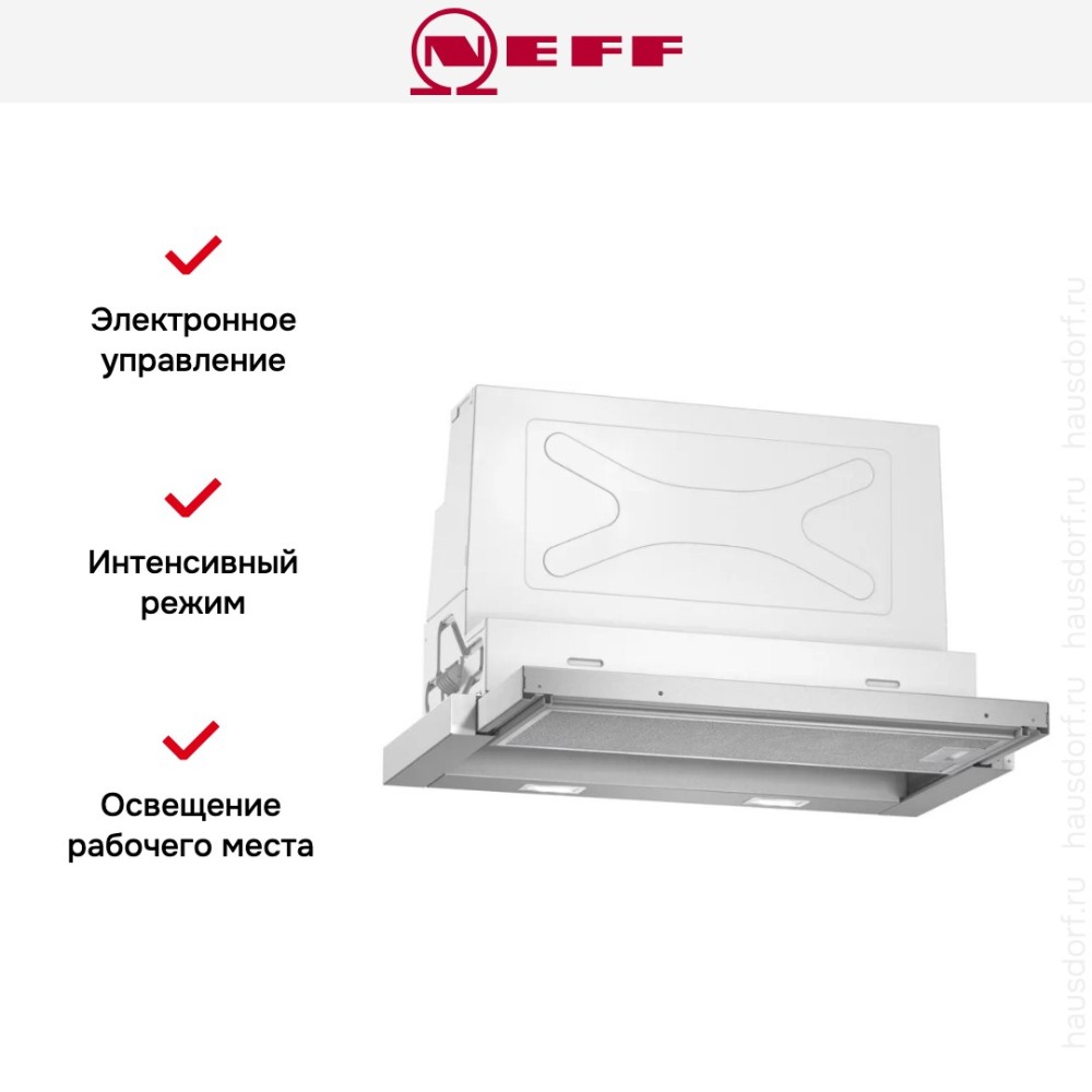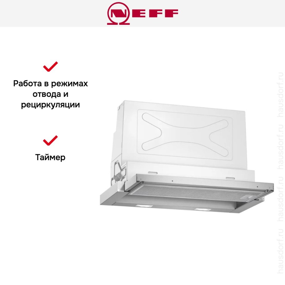| Дополнительные возможности | Для работы в режиме циркуляции требуется установка специального комплекта (дополнительная принадлежность — Z54TS02X0) Выдвижной экран без ручки. Можно декорировать мебельной планкой или декоративной планкой Neff |