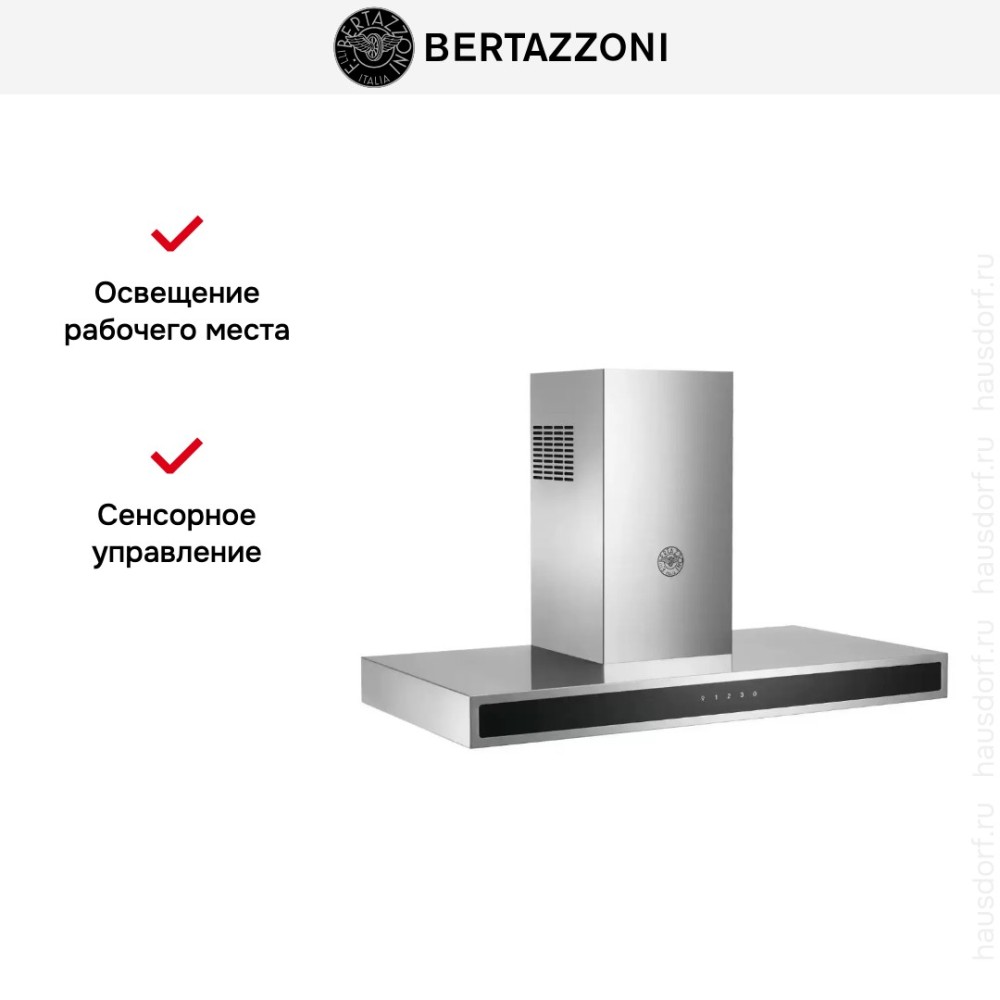 Bertazzoni KG90CONXA — Т-образная настенная вытяжка со стальным корпусом. Оснащена тихим эффективным мотором производительностью 800 м3/ч с 3 скоростями. Две светодиодные лампы хорошо освещают рабочую поверхность. Съемные фильтры можно мыть в посудомоечной машине.