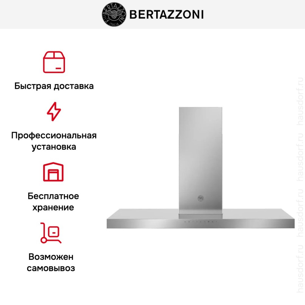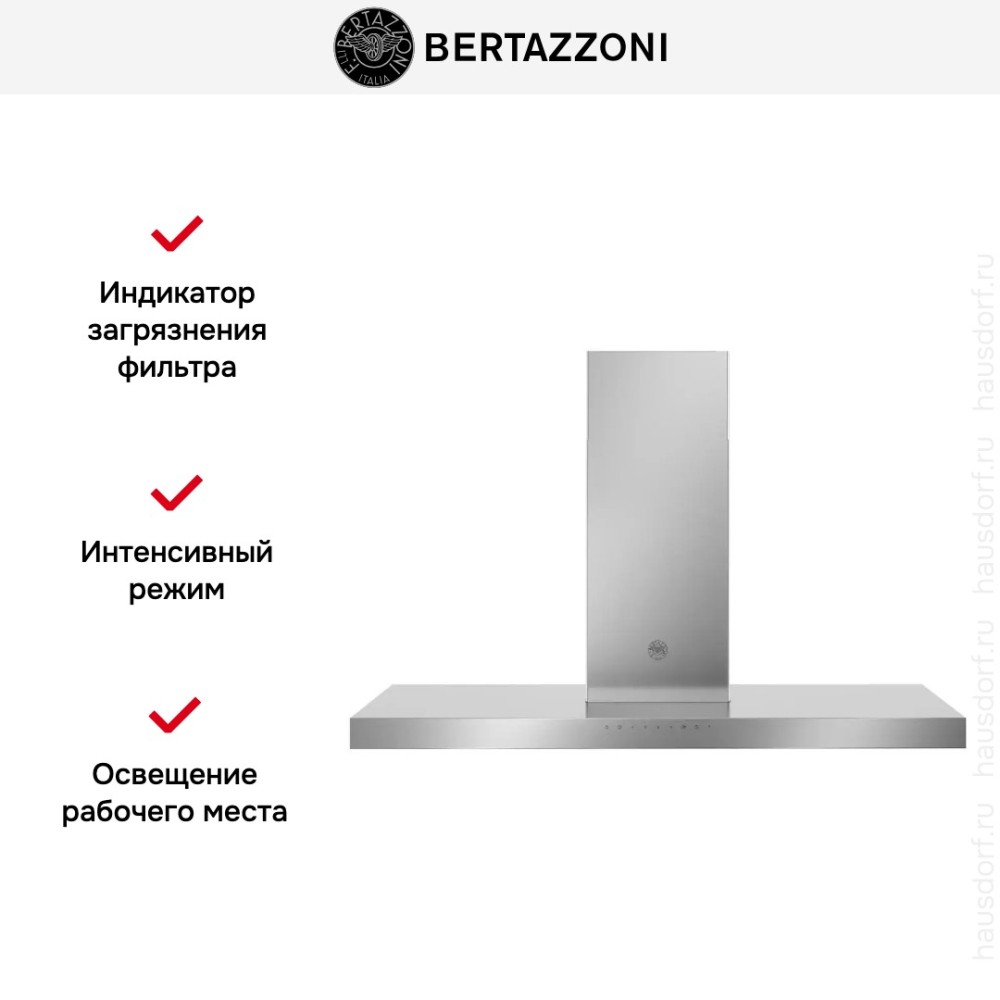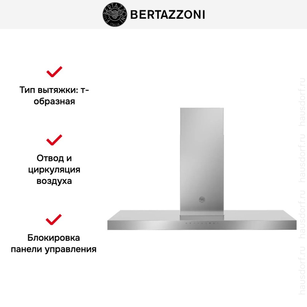 Bertazzoni KT120P1AXT — Т-образная вытяжка из серии Professional. Материал изготовления —долговечная и простая в уходе нержавеющая сталь. Ширина 120 см позволяет разместить вытяжку над варочной поверхностью увеличенного размера на 6 и более конфорок. Максимальная производительность 750 м3/час позволяет очистить воздух в кухне большой площади. Механическая панель управления с кнопками и таймером находится на фронтальной части. Светодиодная подсветка способствует комфортному приготовлению пищи. Для очистки воздуха можно выбрать режимы отвода воздуха или рециркуляции. Три скорости работы, интенсивный режим для очистки сильно загрязненного воздуха и режим «24 часа» способствуют созданию здоровой атмосферы в помещении. Вытяжка оснащена стальным моющимся жироулавливающим фильтром с индикацией загрязнения.
