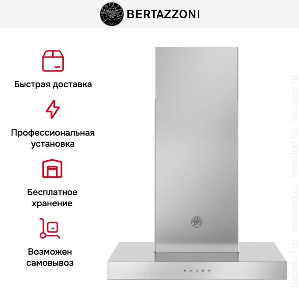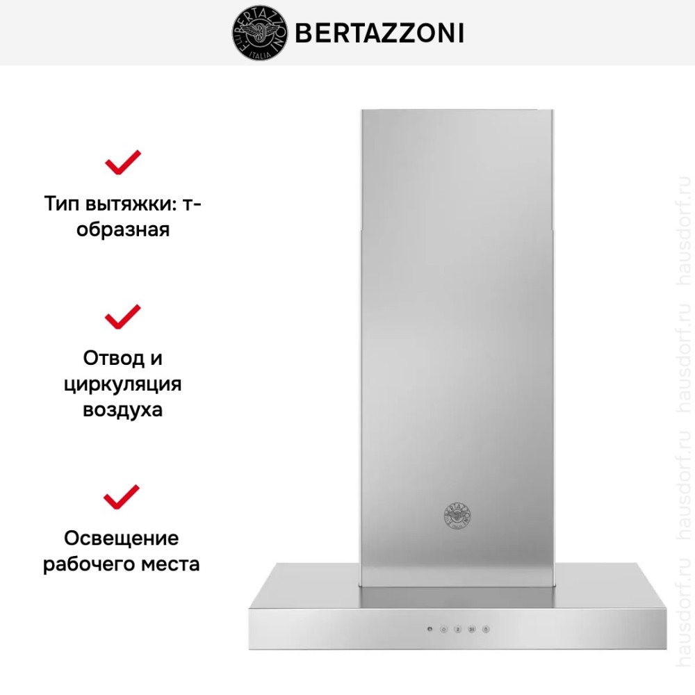 Bertazzoni KT60P1XV — Т-образная вытяжка из дизайн-серии Master шириной 60 см. Модель в корпусе из нержавеющей стали подойдет для размещения над варочной поверхностью с четырьмя конфорками. Максимальная производительность составляет 710 м3/час, а высота может варьироваться в пределах от 79 до 106 см, что позволяет установить вытяжку в просторной кухне с высокими потолками. Механическая панель управления с кнопками выбора скоростей и включения светодиодного освещения находится спереди, всего предусмотрено три скорости всасывания. Прибор может работать в режиме отвода воздуха с подключением к вентиляции, а также в режиме рециркуляции в очисткой воздуха при помощи фильтров. Жироулавливающий фильтр из алюминия входит в комплект поставки, угольный фильтр для защиты от запахов можно установить дополнительно.