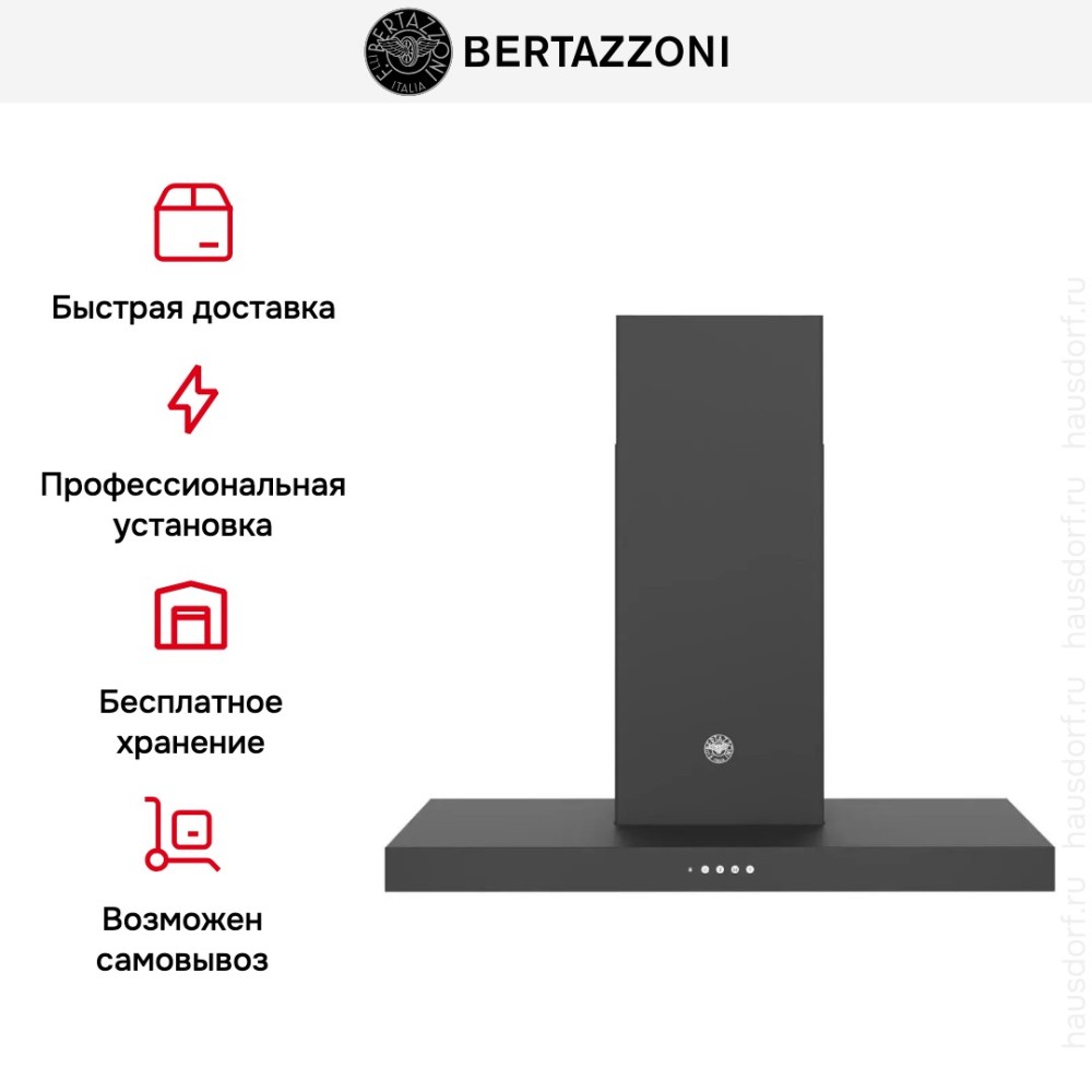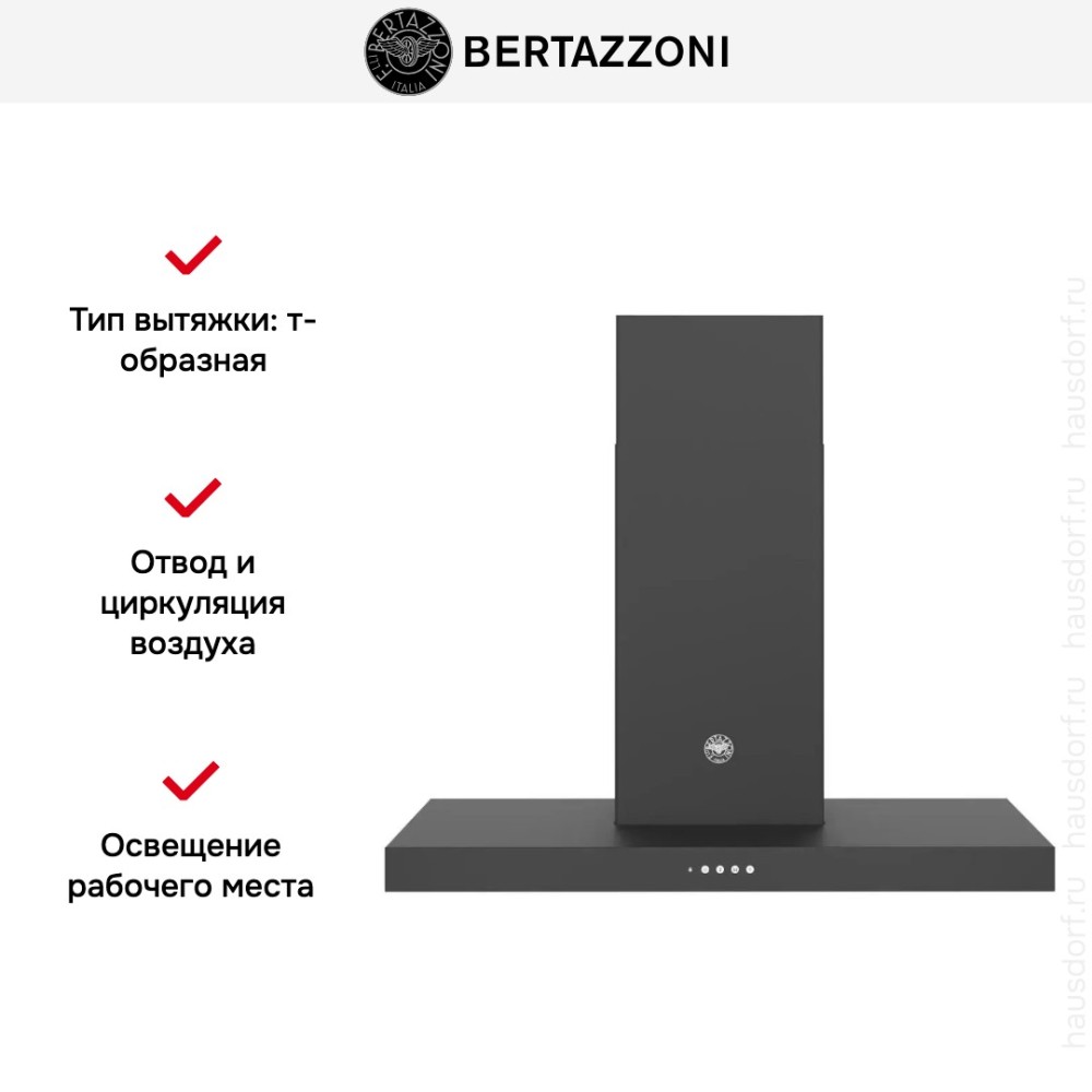 Bertazzoni KT90P1NEV — Т-образная настенная вытяжка из серии Master, изготовленная из нержавеющей стали, окрашенной в черный матовый цвет. Ширина модели составляет 90 см, что соответствует ширине варочной панели с пятью или шестью конфорками. Вытяжка предназначается для работы в режиме отвода с удалением загрязненного воздуха через систему вентиляции или в режиме рециркуляции с очисткой воздуха при помощи системы фильтров. Максимальная производительность достигает 710 м3/час. Механическая панель управления с кнопками выбора одной из трех скоростей всасывания расположена на фронтальной части прибора. Здесь же имеется кнопка включения двух ламп светодиодной подсветки. Жироулавливающий фильтр из алюминия с возможностью мытья в посудомоечной машине входит в комплект, угольный фильтр можно приобрести отдельно.