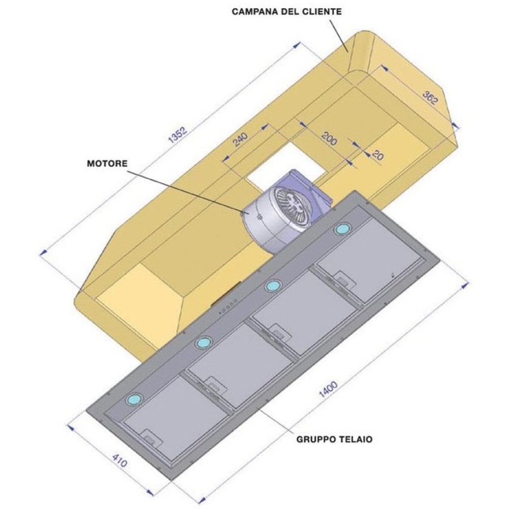 Встраиваемая вытяжка Ilve IAG-150 снабжена четырьмя жироулавливающими фильтрами из нержавеющей стали для защиты внутреннего механизма. Галогенная подсветка обеспечивает дополнительный комфорт на кухне. Модель заказывается по двум кодам: код модуля + код мотора. Пульт дистанционного управления возможно приобрести дополнительно.