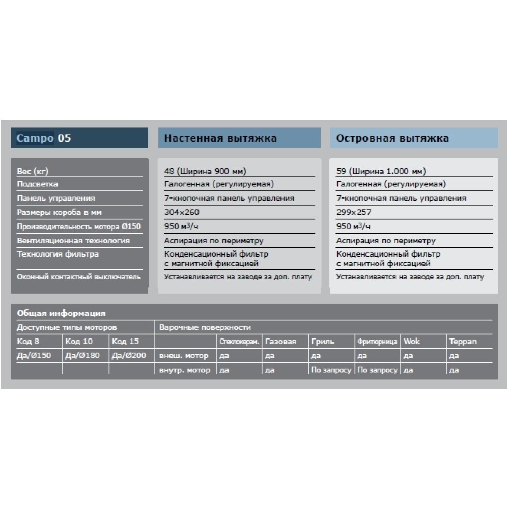 | Режимы работыОтвод / циркуляция | Функция «Остаточный ход»Да | Дополнительные возможностиХарактеристики модели островного монтажа: Габариты (ВхШхГ): 68-83х90-120х60-70 Вес (кг):59 Размеры короба в мм: 299 x 257 7-кнопочная панель управления Лампы подсветки: 4 х 20 Вт |