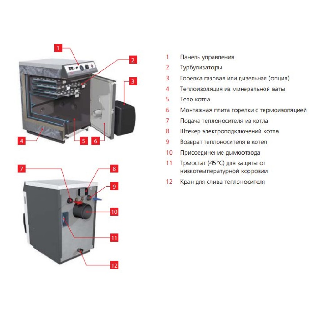 - Оснащен термостатом (45°С) для защиты от низкотемпературной коррозии