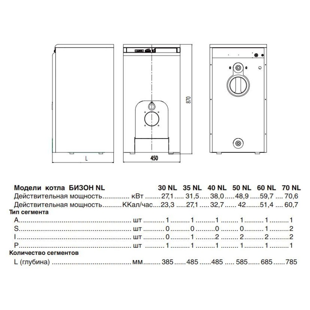 Protherm Бизон 30 NL предлагаемая модельная серия, является напольными чугунными котлами мощностью от 30 до 80 кВт для разогревания воды во внешнем бойлере. Магистральный и сжиженный газ, дизельное топливо или мазута любой из видов топлива может использоваться для работы котла совместно с определенным типом горелки. На главной панели имеется возможность отображения температуры и давления теплоносителя в системе отопления, которая дает возможность контролировать работу отопительной техники. Отопительный котел достаточно комфортный и удобный в эксплуатации и обслуживании. Специальная система управления котла позволит вам установить комфортный микроклимат в помещении. Квартиры, жилые дома и дачные домики свободно могут отапливаться с помощью подобного оборудования.