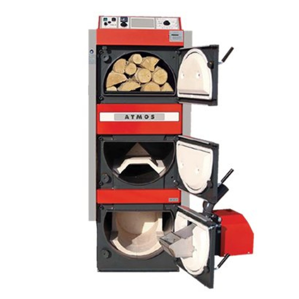 Комбинированный котел ATMOS (Атмос) DC 18 S выполнен с тремя камерами, которые расположены друг под другом. Первые две камеры предназначены для осуществления процесса пиролиза, а третья, самая нижняя, оснащена горелкой и выложена керамикой, обеспечивающей наиболее оптимальное качество сжигания топлива. Оборудование отличается высоким КПД и может очень долгое время работать на одной закладке топлива.