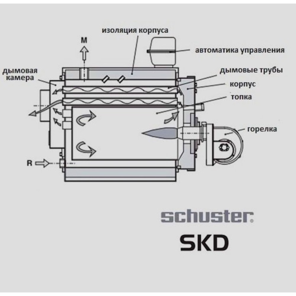 - Котлы отопления Schuster относятся к типу цилиндрических горизонтальных котлов с топочной инверсией пламени и имеют по три газохода в котловном блоке.