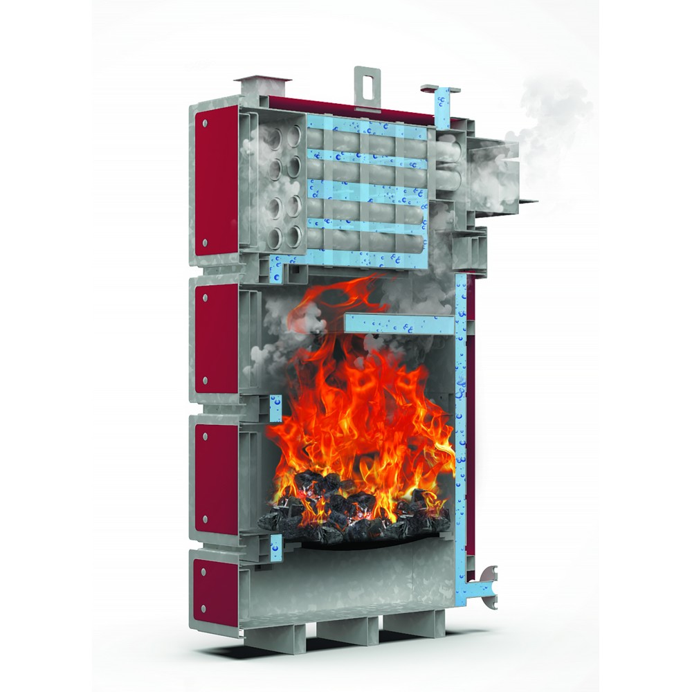 Промышленный отопительный твердотопливный котел "Сибирь Т" - 130 кВт оборудован жаротрубным теплообменником, закрытый снаружи водяной рубашкой. Теплообменник представляет собой многоступенчатую конструкцию дымовых каналов. Горячие газы после зоны дожига проходят через стальной жаротрубный теплообменник, где, отдав тепло, охлаждаются. Охлажденные газы выходят из котла через дымоход, соединенный с дымовым патрубком. Расположение дверей теплообменника, засыпной, камеры сгорания и зольника позволяет получить быстрый доступ к топке для очистки и розжига. Широкая засыпная дверца облегчает загрузку топлива. Воздух, необходимый для правильного процесса сжигания, подается вентилятором благодаря системе наддувных втулок, расположенных непосредственно в области загруженного топлива. Микропроцессорный регулятор постоянно измеряет температуру воды в котле и соответственно устанавливает силу наддува вентилятора, регулируя количество воздуха, необходимого для процесса сжигания.