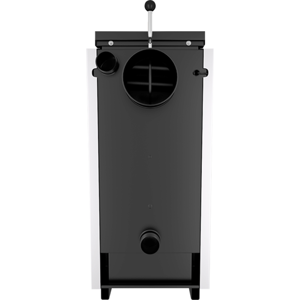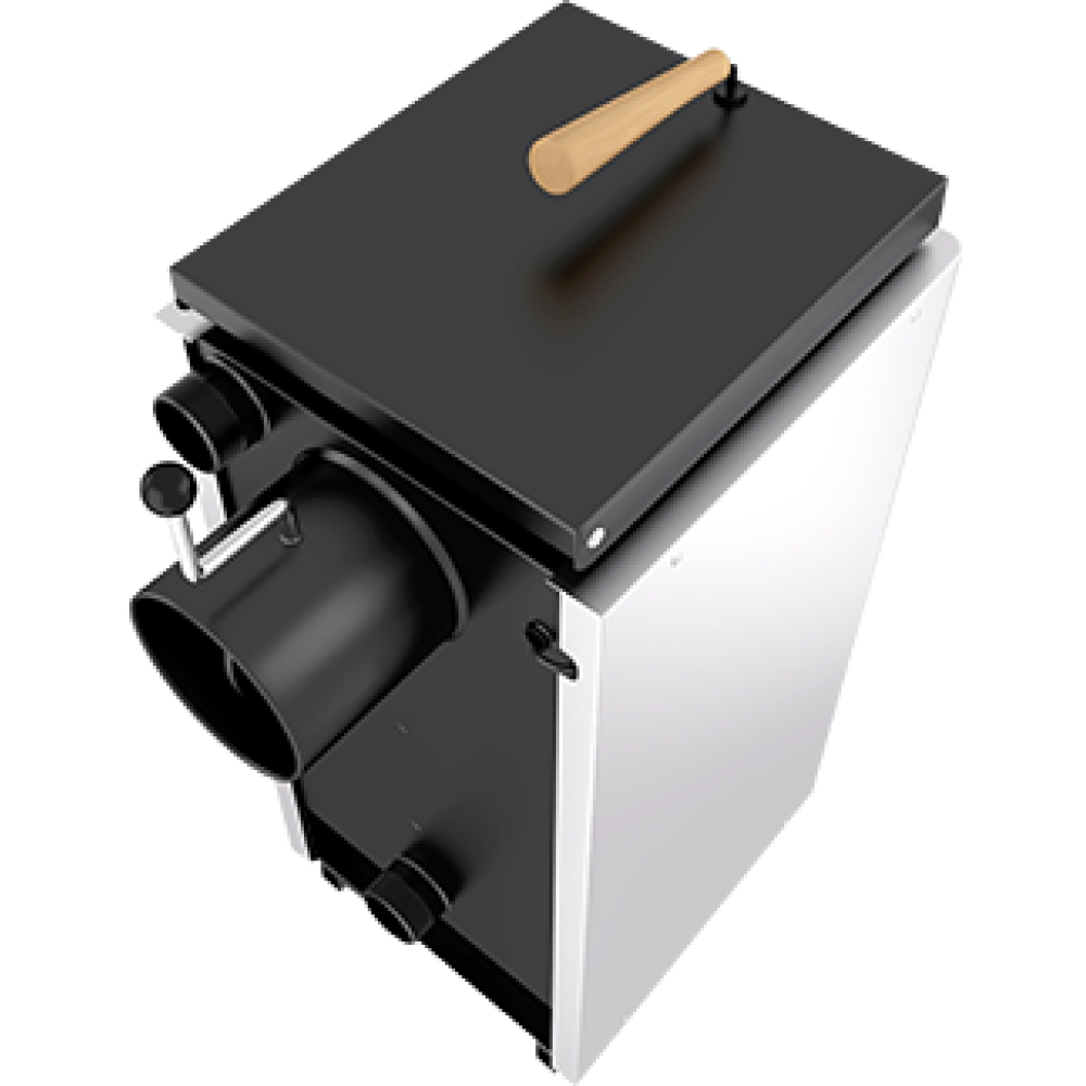 - Верхняя загрузка обеспечивает не только удобство загрузки прямо из ведра, но и позволяет равномерно заполнить топливную камеру в отличие от котлов с передней загрузкой через дверцу (особенно многосекционных с длинным теплообменником), которые требуют дополнительных затрат времени и усилий для равномерного распределения топлива по загрузочной камере.