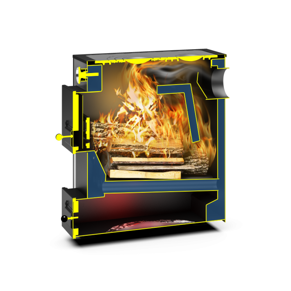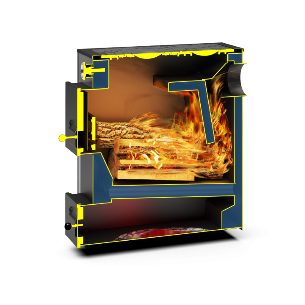 - Глубокая наклонная топка для использования длинных дров и равномерного распределения угля по всей глубине топки при засыпке.