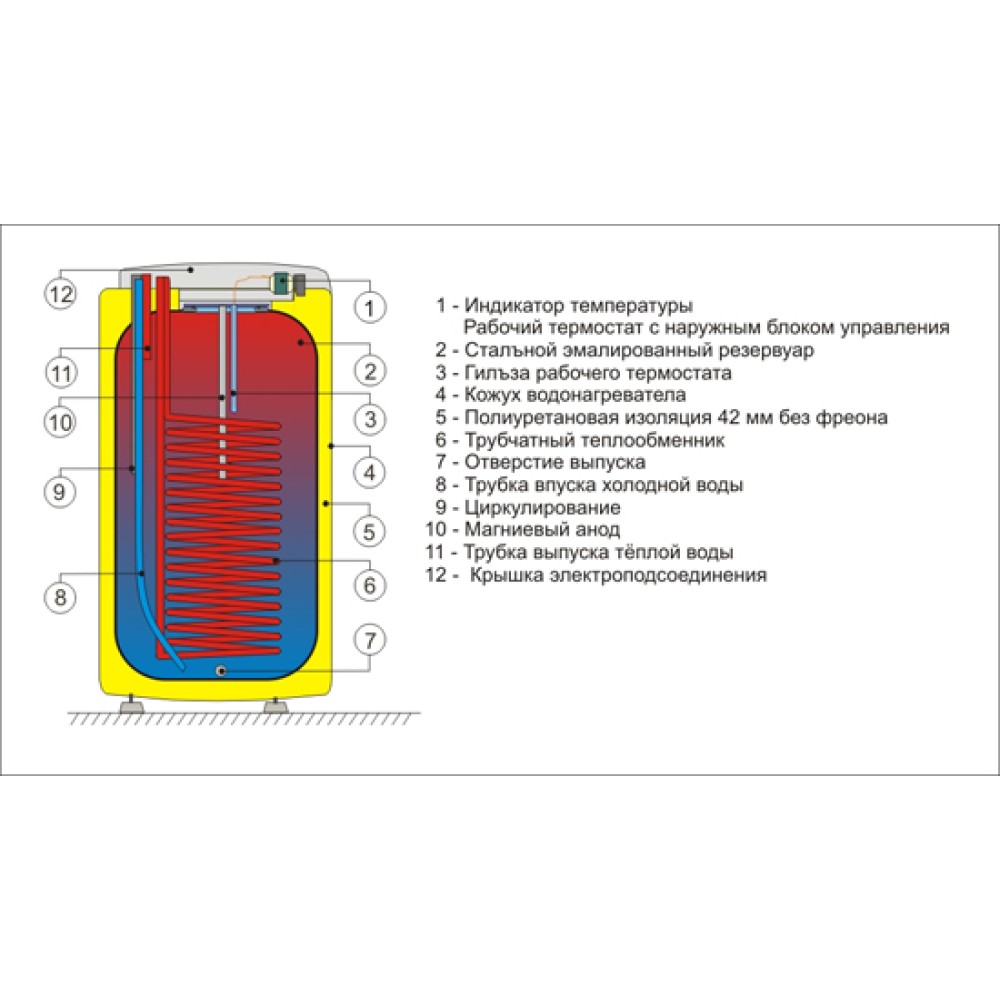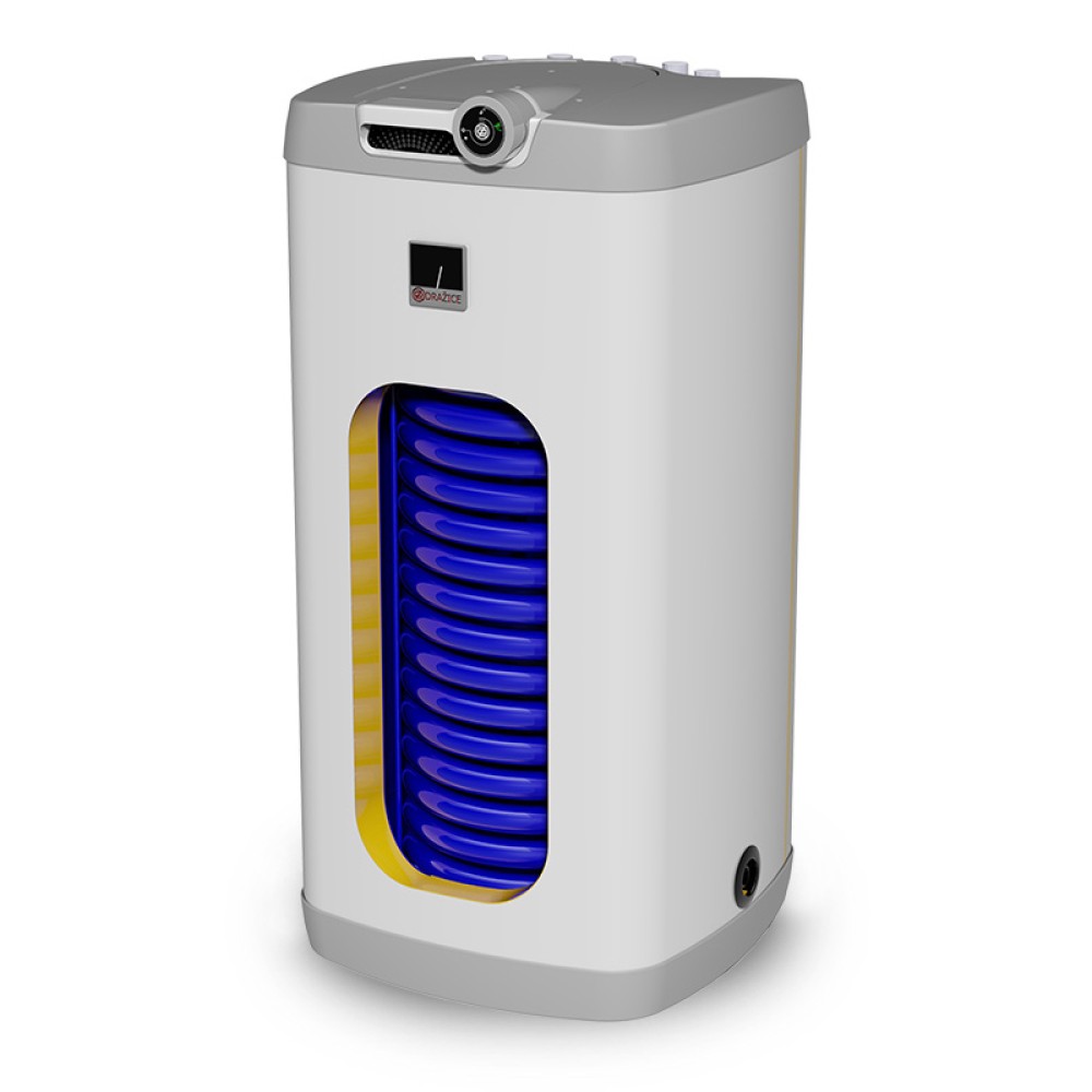 - Напольные водонагреватели косвенного нагрева объёмом 100–160 литров с эмалированным резервуаром и мощным теплообменником, монтируемые под навесным газовым котлом.