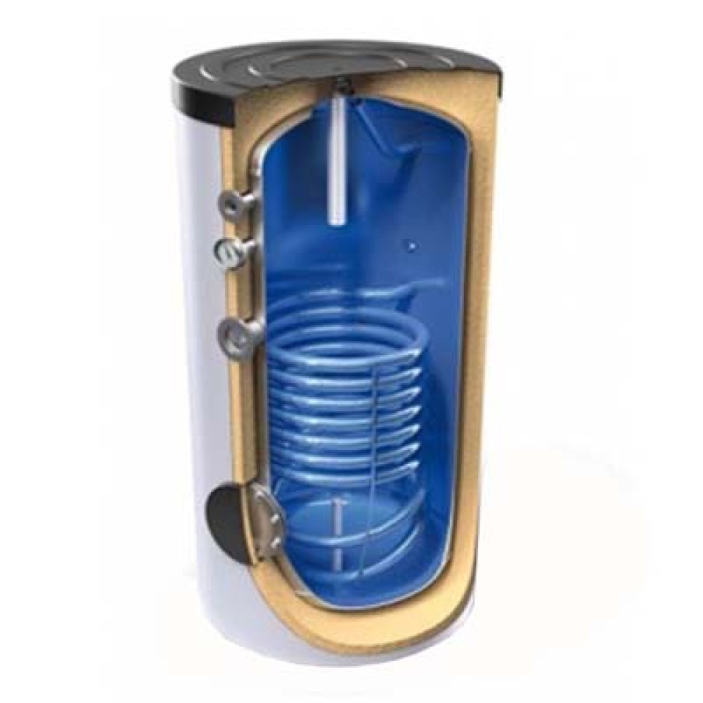 Бойлер представляет собой современное устройство для производства и хранения горячей воды (ГВС). Конструкция бака представляет собой стальной теплоизолированный резервуар, в котором расположен 1 теплообменник для подключения внешнего нагревателя или солнечных коллекторов. Нагрев бака осуществляется через встроенный теплообменник.