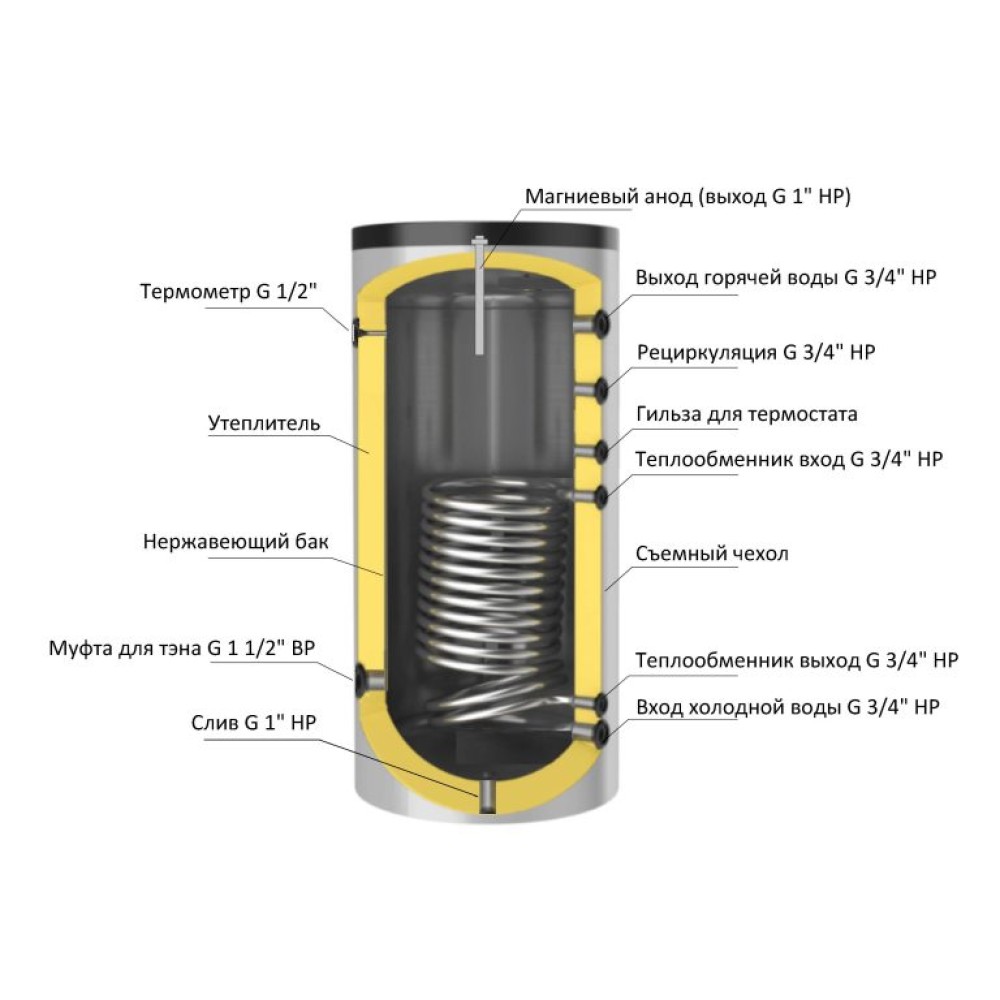 Каждый водонагреватель проходит контроль качества, испытывается при давлении 12 bar. Установлен теплообменник увеличенной мощности, площадь змеевика составляет 1,4 м2. Водонагреватели изготавливаются из качественной нержавеющей стали, все сварные швы выполняются на новейшем австрийском оборудовании. Водонагреватель имеет съемную теплоизоляцию из полиуретана, позволяет пронести в проем 460 мм.