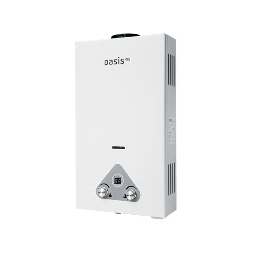 Газовый проточный водонагреватель Oasis Eco предназначен для горячего водоснабжения квартир, частных домов и коттеджей, оборудованных дымоходом. Принцип его работы достаточно прост: вода проходит через теплообменник прибора и моментально нагревается от сгорающего газа, поступая к потребителю уже горячей. Розжиг колонки происходит автоматически при открытии крана горячей воды. Прибор работает на природном газе. Имеет регулировку температуры воды и пламени газовой горелки.