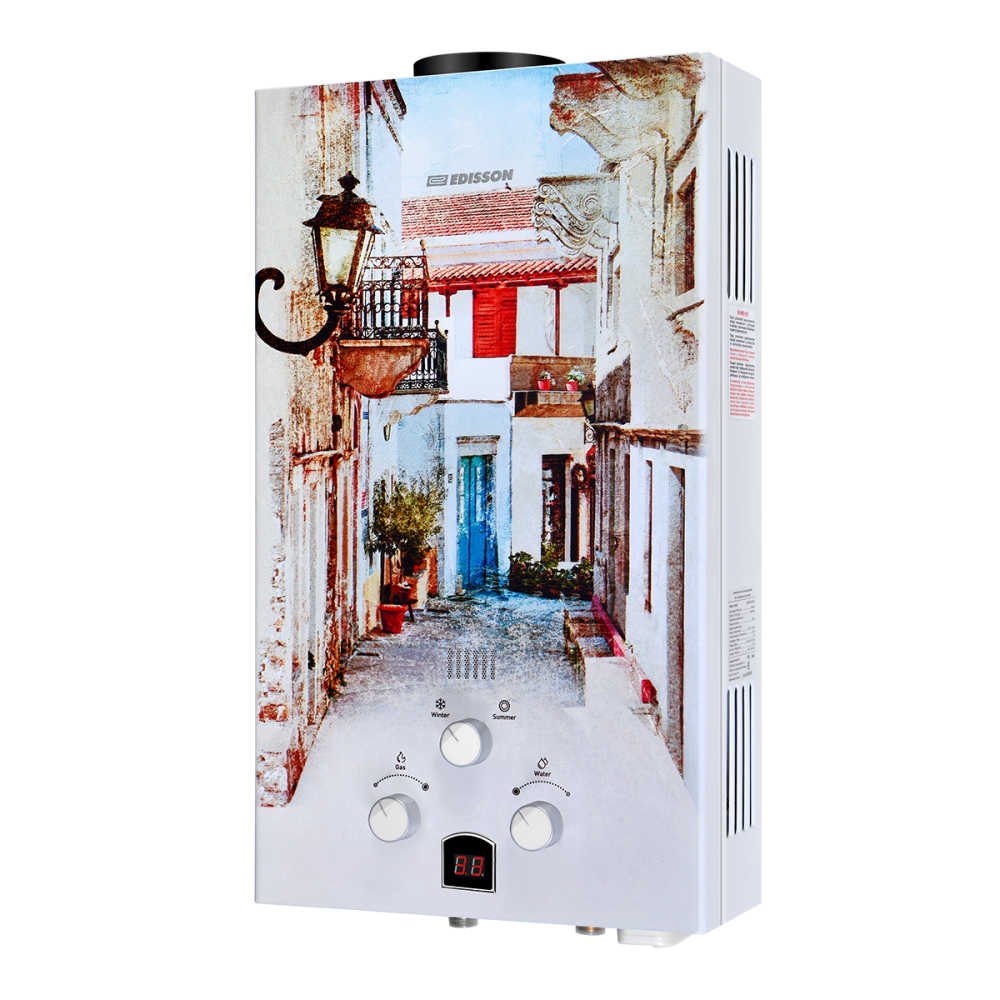 Газовый проточный водонагреватель EDISSON (Эдисон) E 20 GD отличается оригинальным дизайном и сделает интерьер помещения более жизнерадостным. Модель оснащена удобным и понятным управлением с цифровым дисплеем. Предусмотрены летний и зимний режимы работы, что позволят сократить расход топлива в теплое время года.
