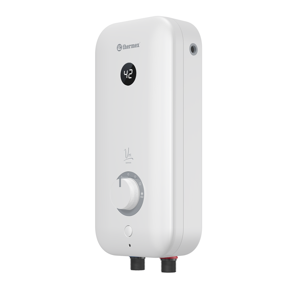 Серия Vox электрических проточных водонагревателей марки Thermex представлена двумя настенными моделями максимальной мощностью 4.5, 5.5 кВт с механическим типом управления и медным нагревательным элементом. Модели выполнены в плоской конструкции, имеют компактные габариты, легкий вес и прекрасно подходят для небольших санузлов.